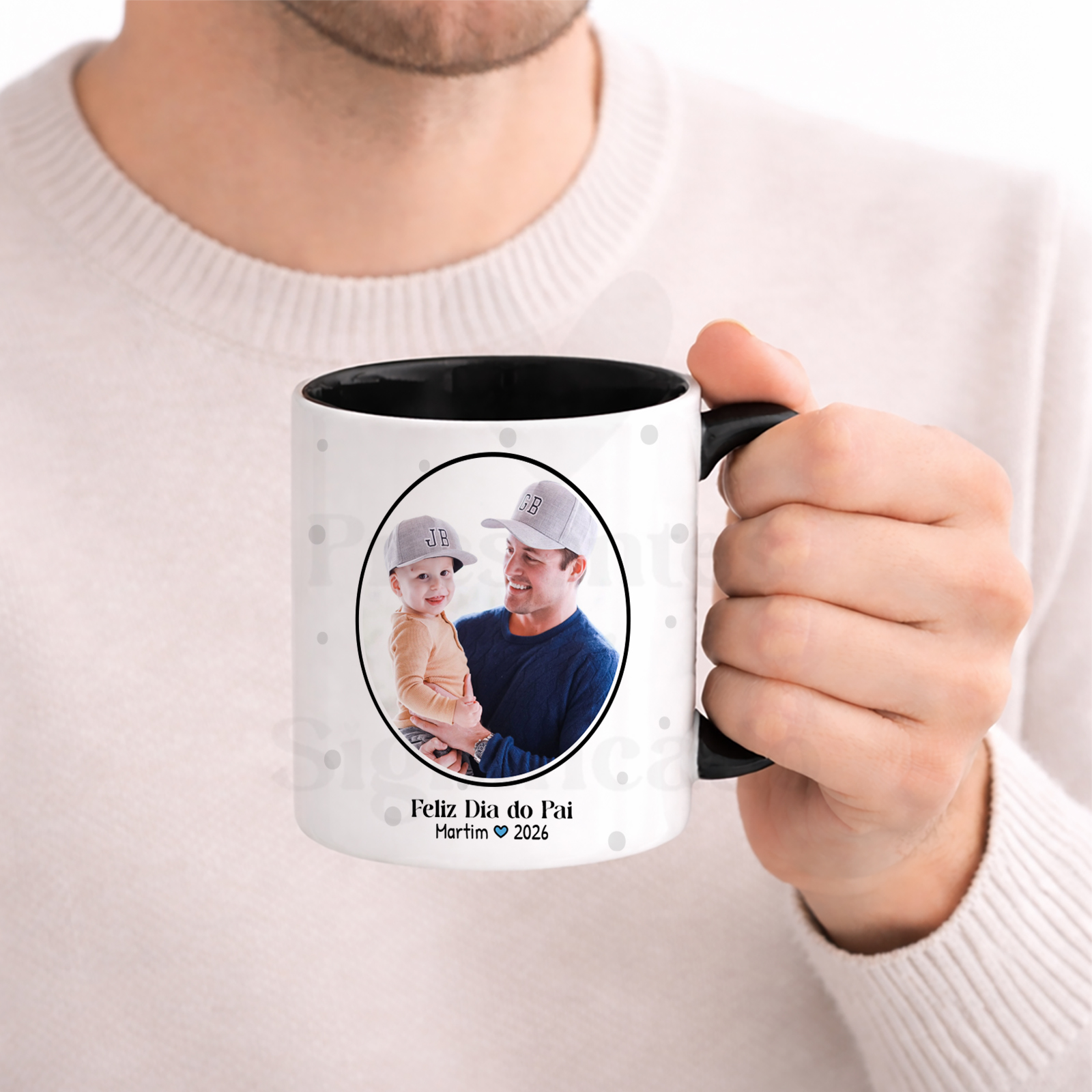 Caneca de cerâmica com texto "Tal pai, tal filho!". Pode personalizar nomes/datas no texto assim como a foto.