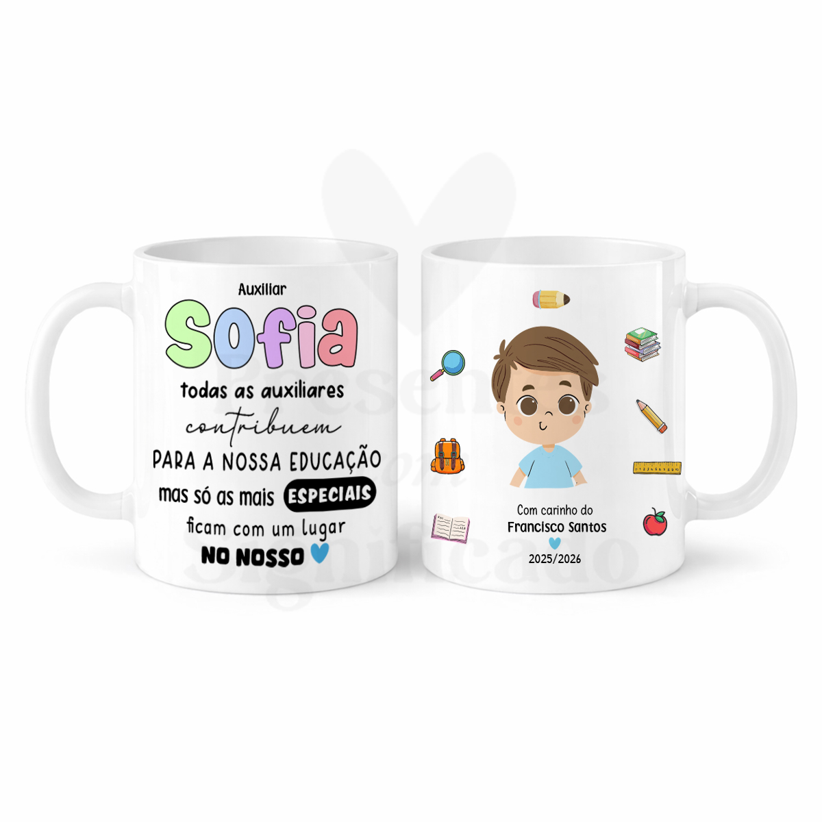 Caneca de cerâmica com texto e desenhos "Todas as educadoras contribuem para a nossa educação mas só as mais especiais ficam com um lugar no nosso coração". Pode adaptar para Educadora, Professora, Auxiliar, Catequista...
