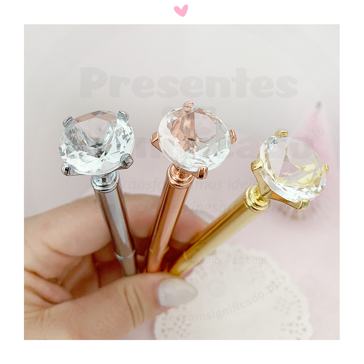 Caneta de metal com gravação personalizada. No topo é decorada com pedra no formato diamante conferindo-lhe um aspeto mais elegante. Personalize com nomes, datas ou uma frase curta a seu gosto.