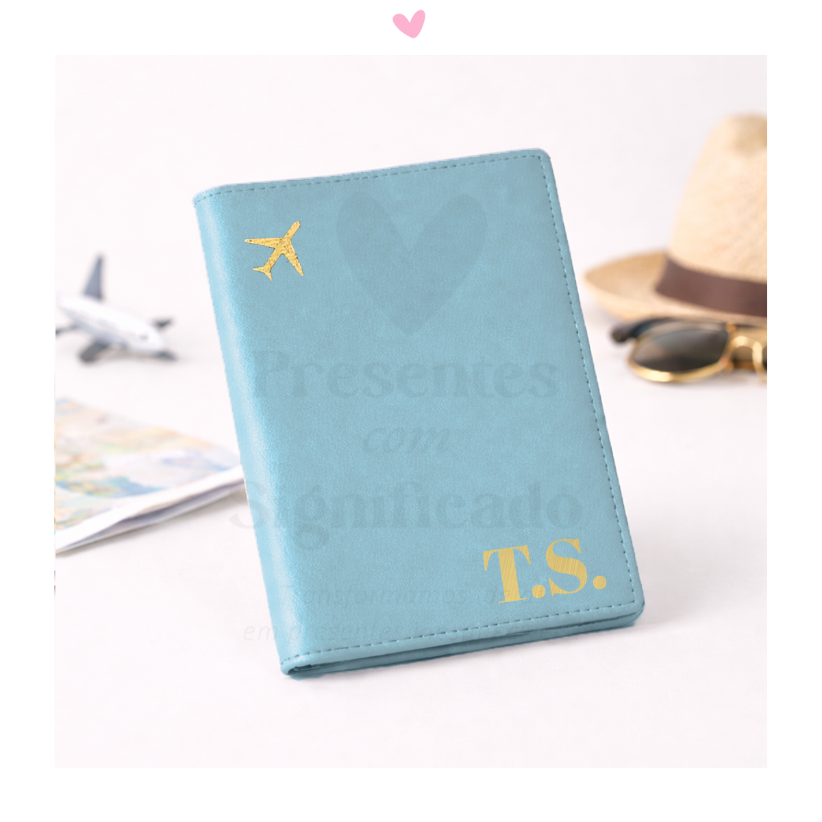 Capa em polipele sintética para guardar o passaporte. Personalizada a dourado por fora com nome e frase ou iniciais no canto. Podemos personalizar com qualquer uma das nossas frases ou uma frase a seu gosto.