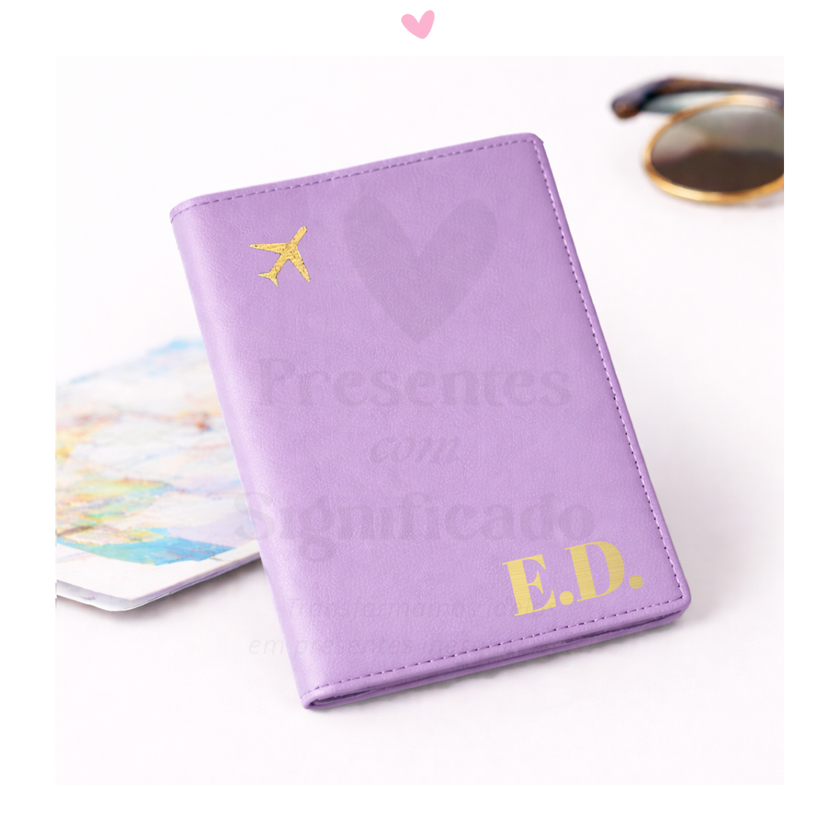 Capa em polipele sintética para guardar o passaporte. Personalizada a dourado por fora com nome e frase ou iniciais no canto. Podemos personalizar com qualquer uma das nossas frases ou uma frase a seu gosto.