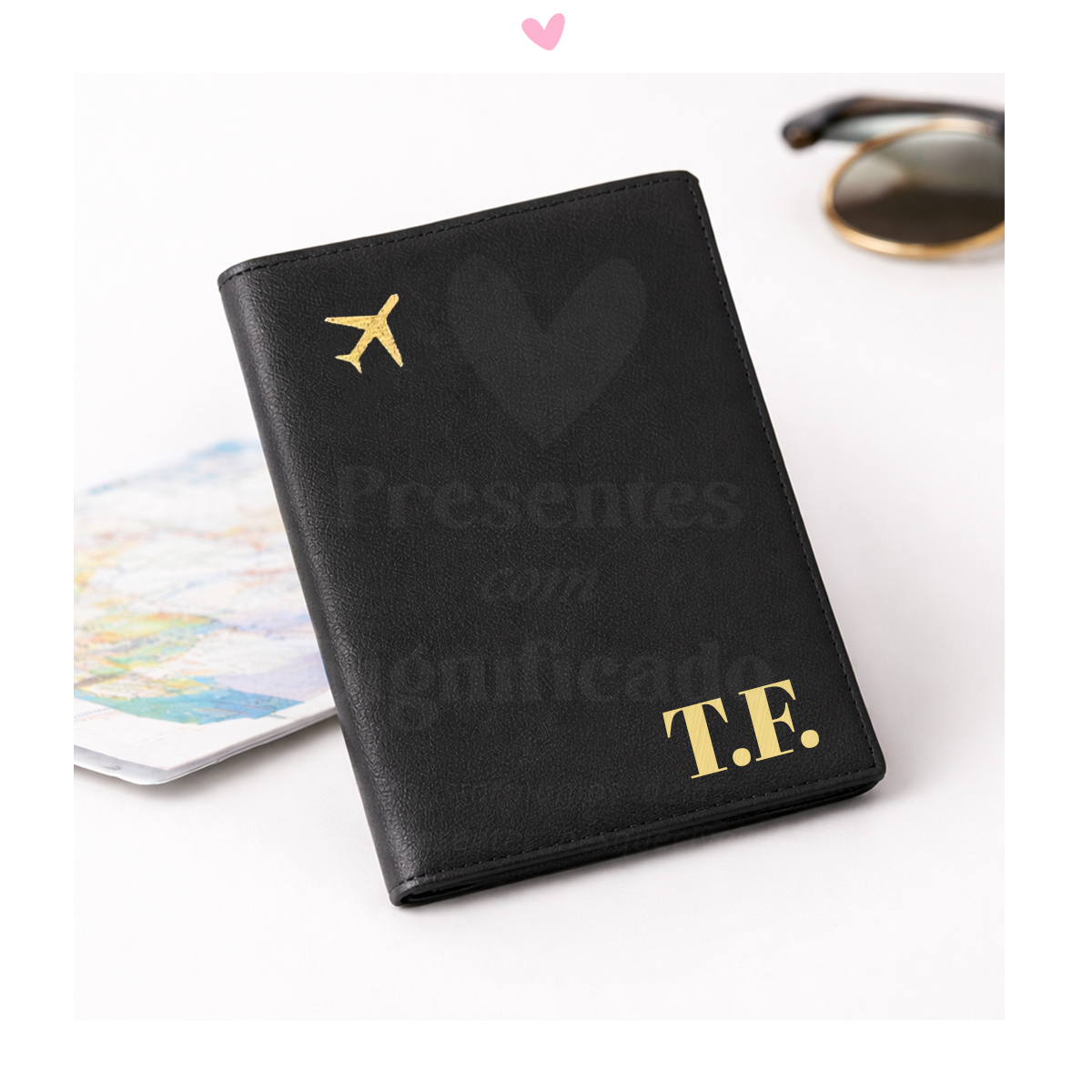 Capa em polipele sintética para guardar o passaporte. Personalizada a dourado por fora com nome e frase ou iniciais no canto. Podemos personalizar com qualquer uma das nossas frases ou uma frase a seu gosto.