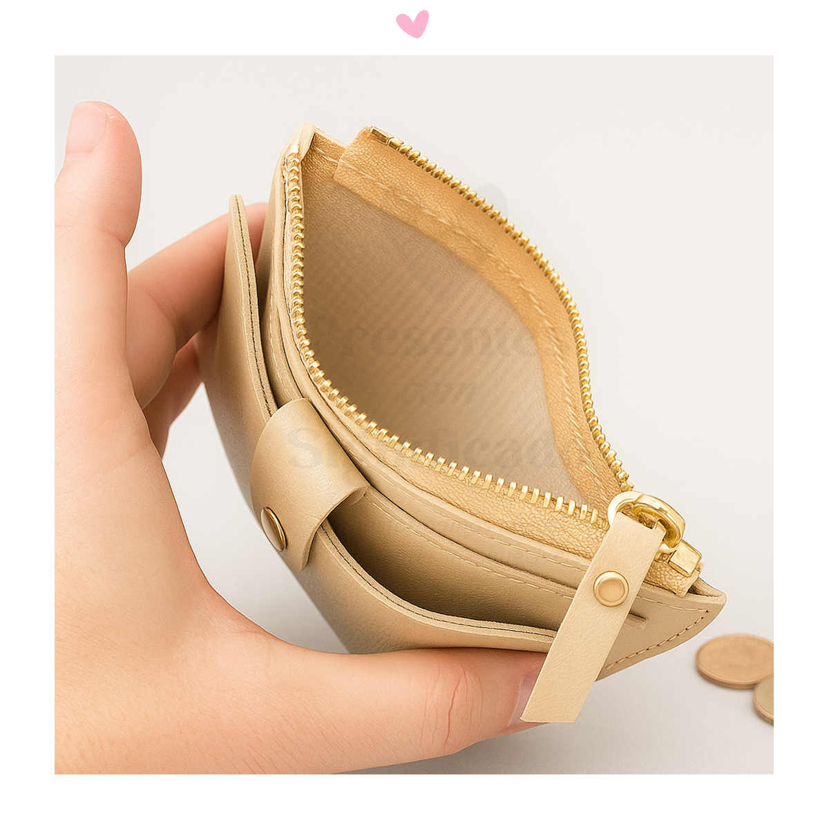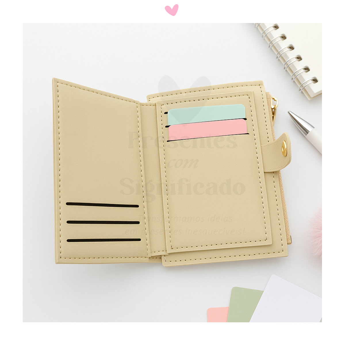 Carteira de cor bege tamanho médio com porta-moedas e porta-cartões. Personalizada com nome ou texto até 5/6 palavras.