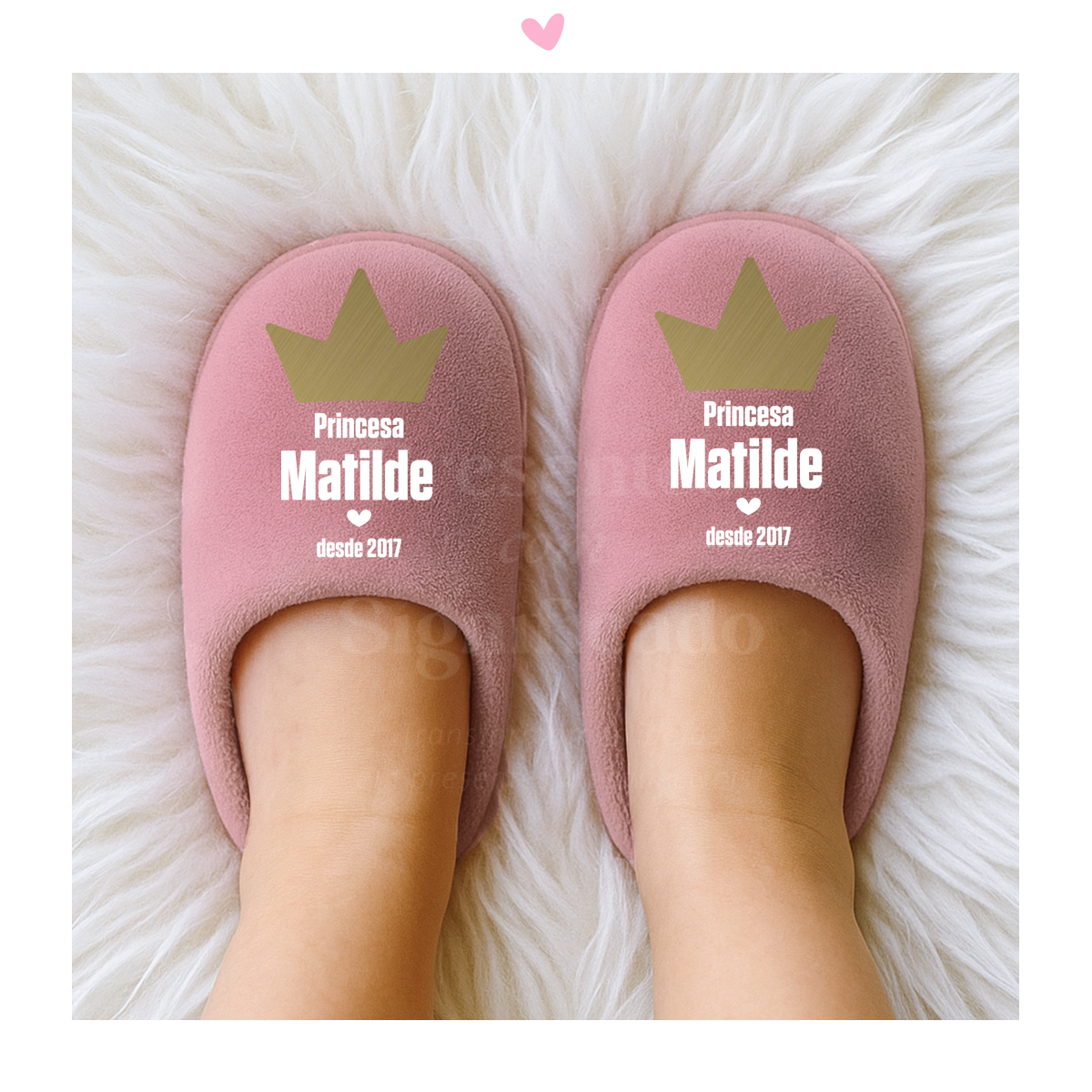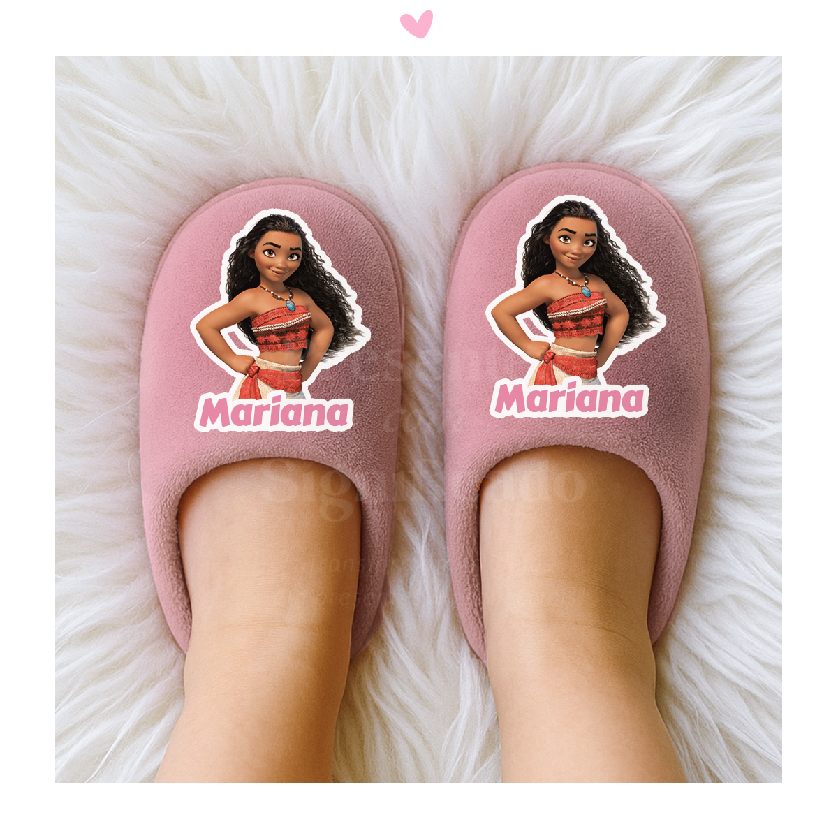 Par de chinelos de quarto de criança em rosa personalizados com qualquer frase ou imagem a gosto. Exterior em pelinho e interior forrado com pelo quentinho; sola de borracha branca antiderrapante c/ desenho.