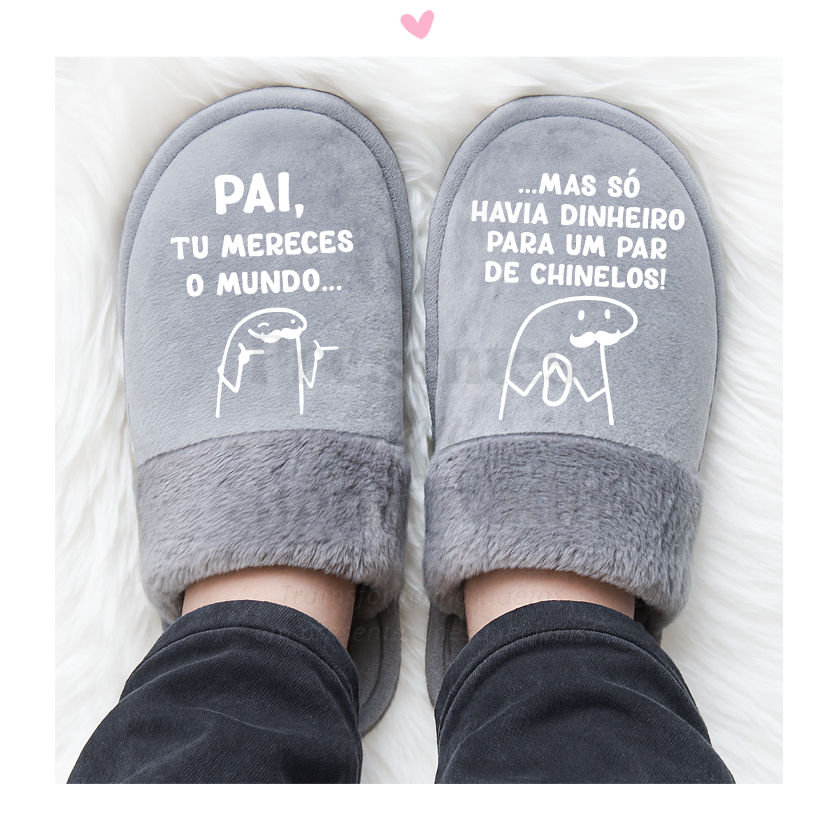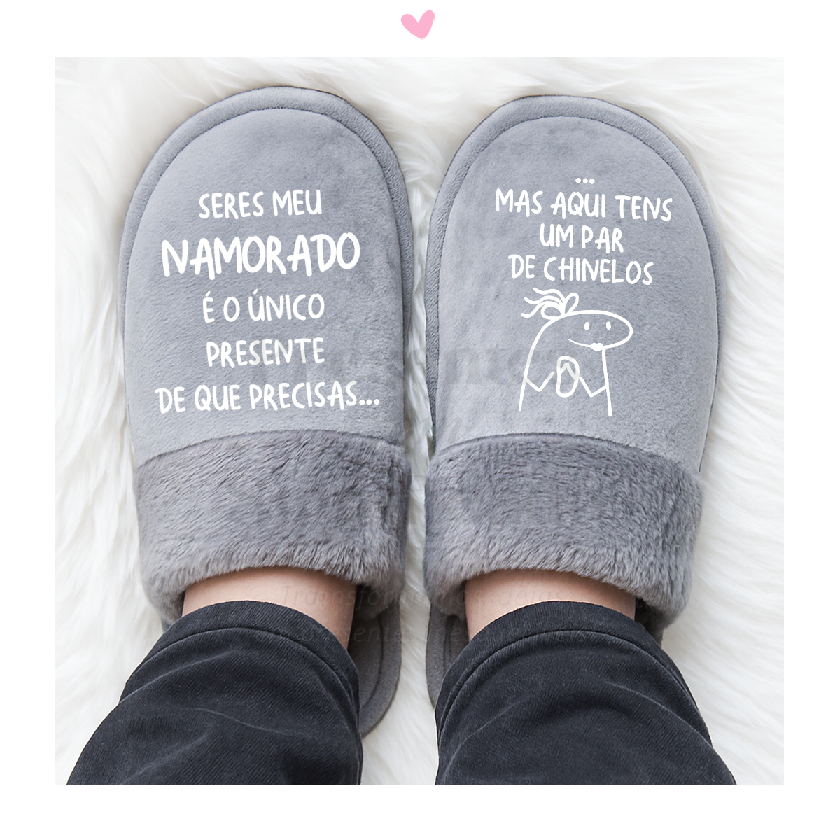 Par de chinelos de quarto personalizados com qualquer frase a seu gosto. Exterior em tecido tipo veludo com faixa de pêlo baixo e sola interior ligeiramente almofadada. Solas em EVA/espuma.