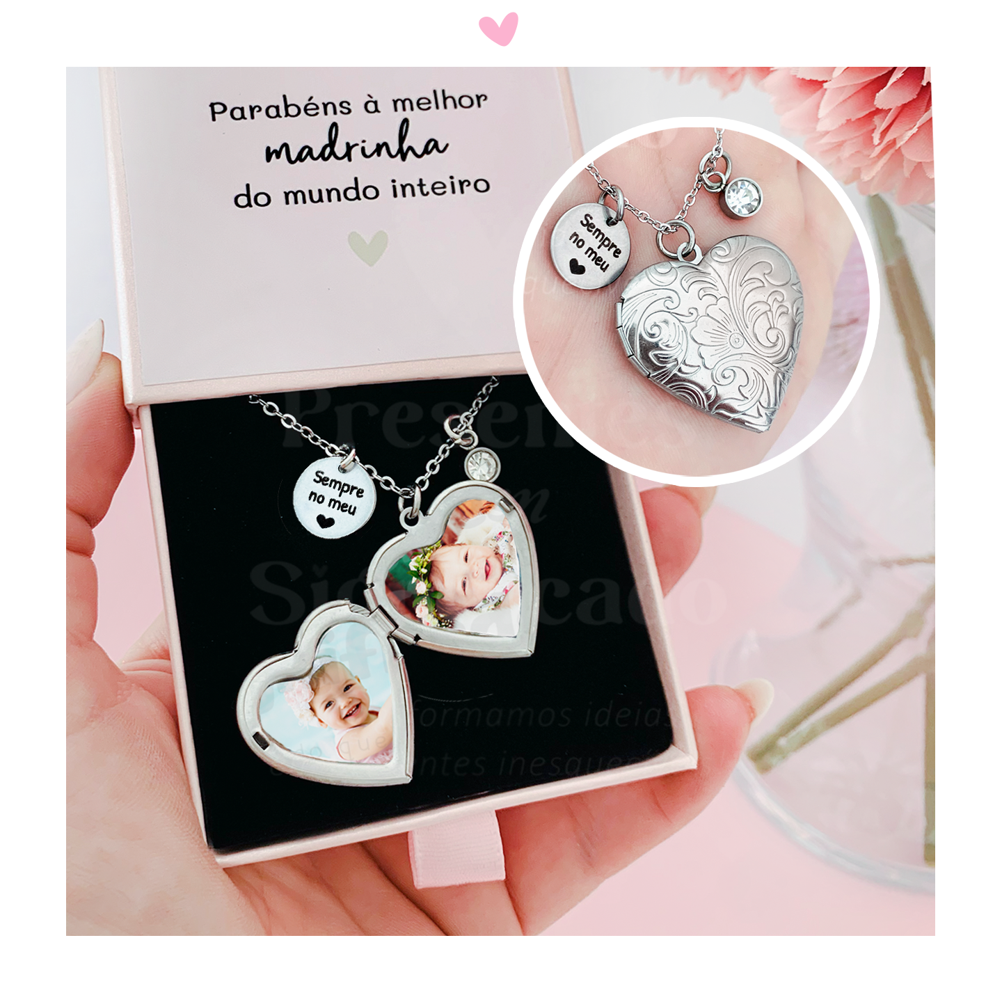 Colar com medalhão coração com padrão floral no exterior, em aço inoxidável. Inclui pendente gravado e colocação de foto(s) no interior (máximo 2).