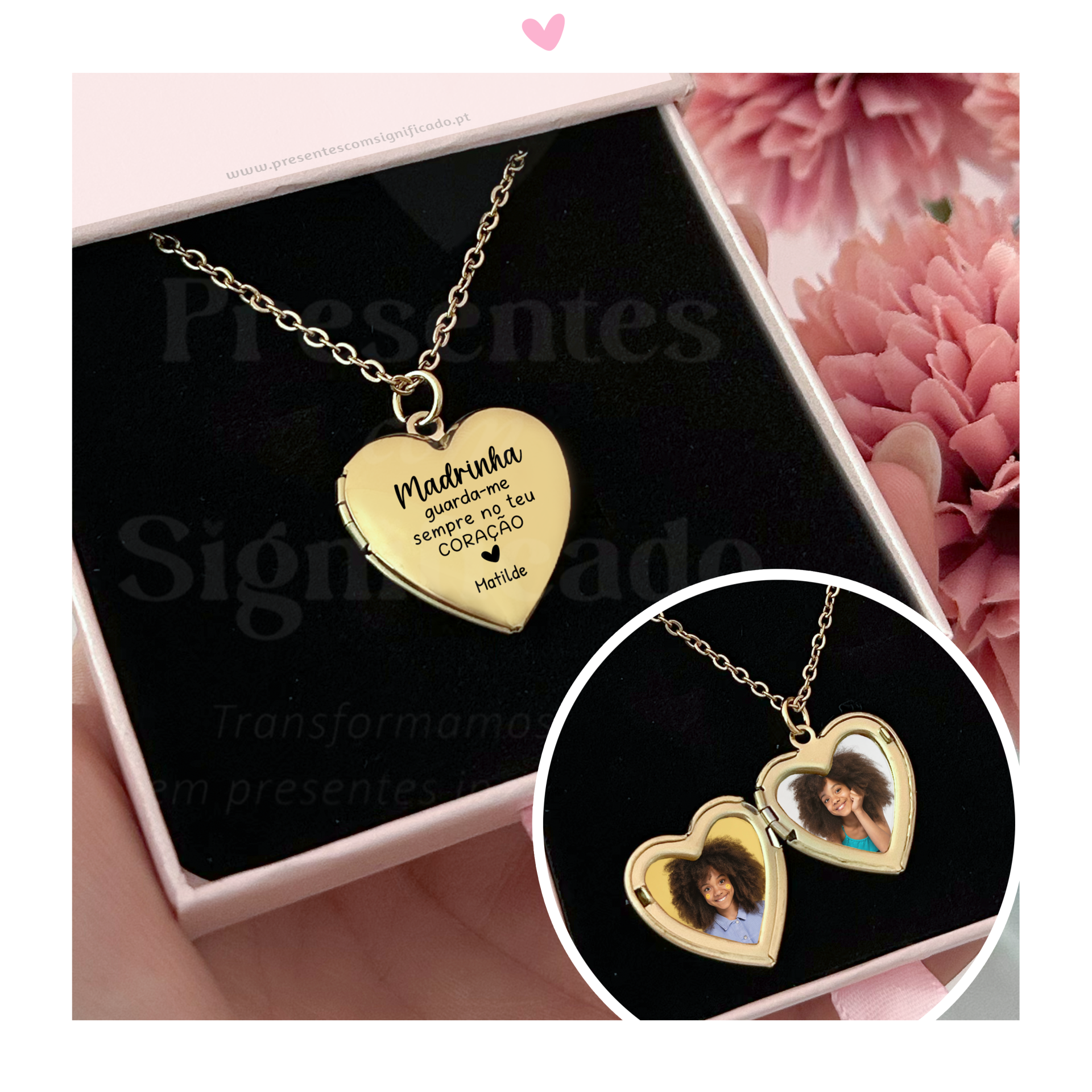 Colar com medalhão coração em aço inoxidável. Modelo simples com gravação personalizada por fora. Inclui colocação de foto(s) no interior (máximo 2).