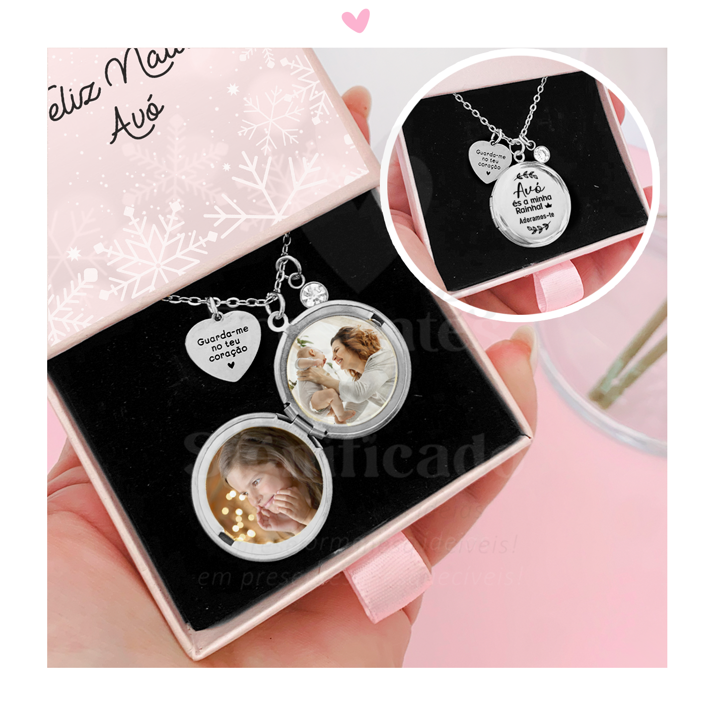 Colar com locket de formato redondo em aço inoxidáve escovado.Inclui pendente pequeno gravado, gravação por fora e colocação de foto(s) no interior (máximo 2)