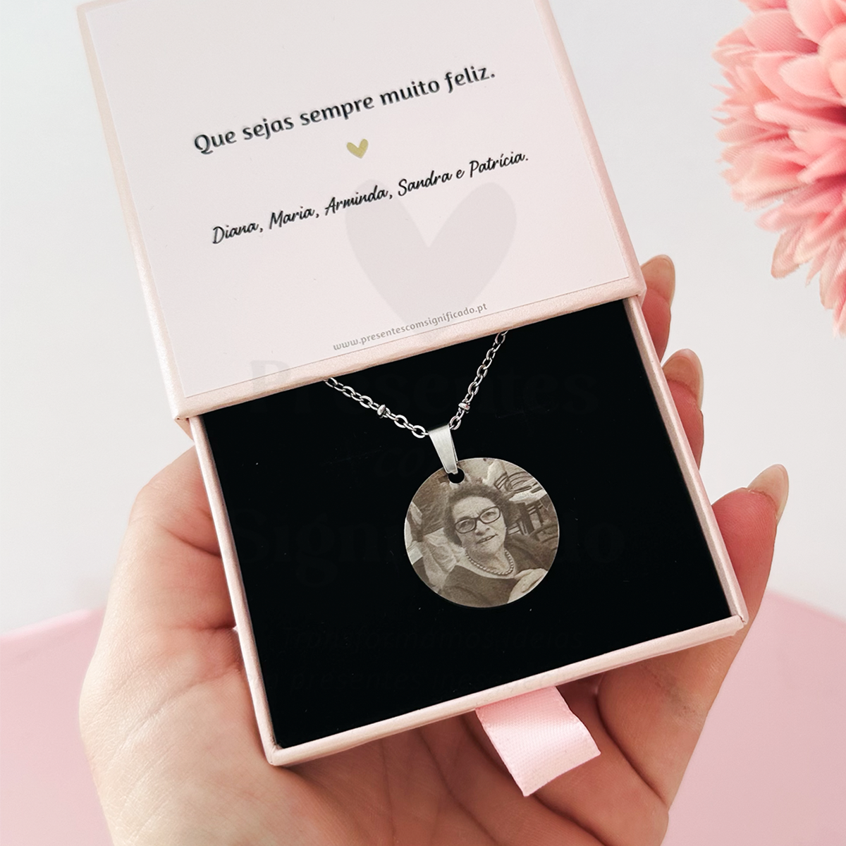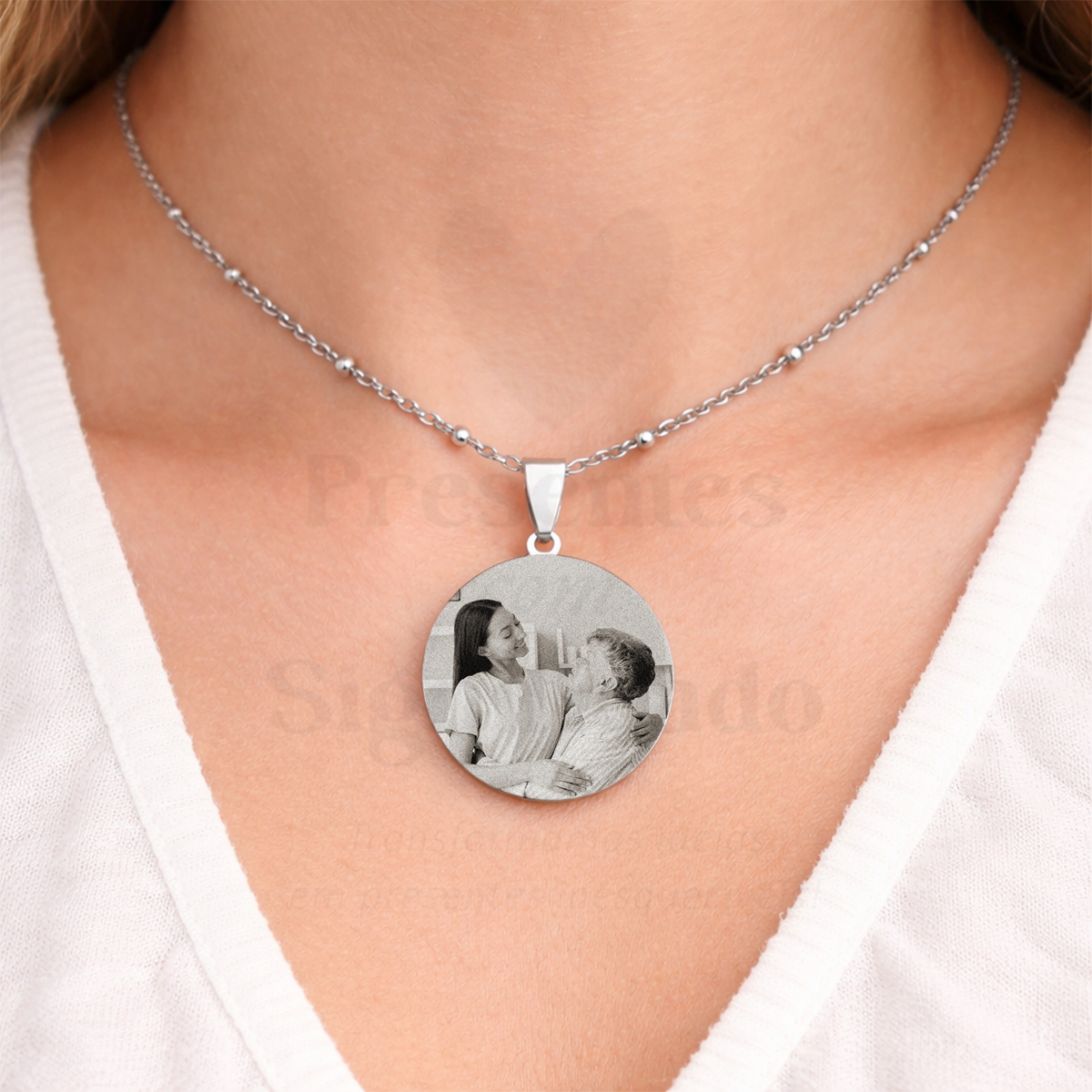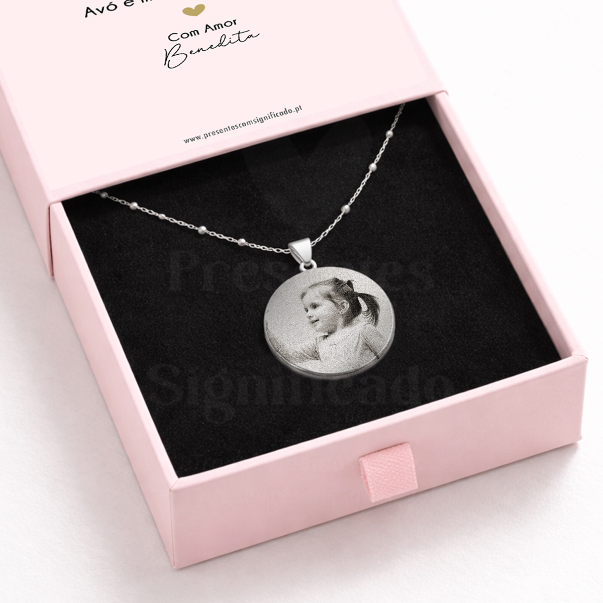 Colar curto em aço inoxidável com corrente trabalhada com entremeios de bolas e medalha formato redondo com foto-gravação (fotografia gravada diretamente na chapa de aço) e gravação de texto no verso.