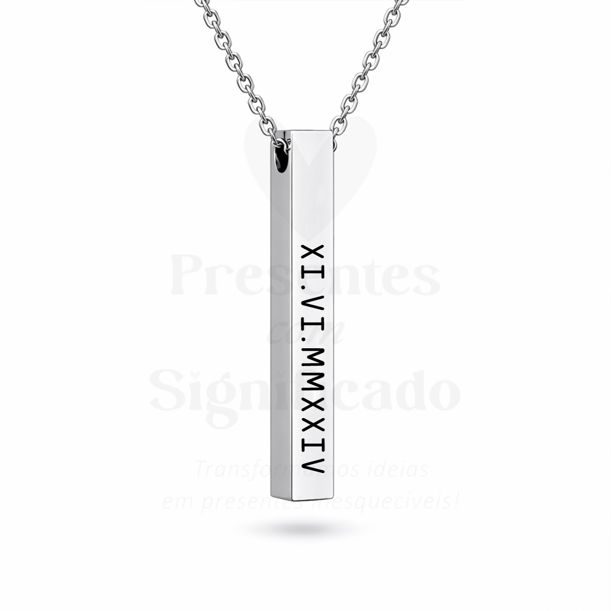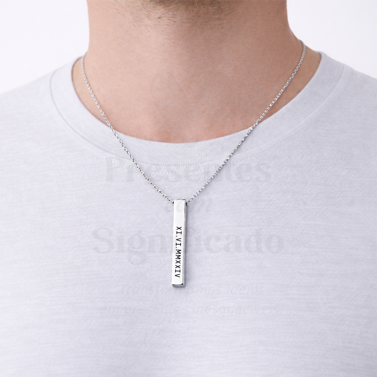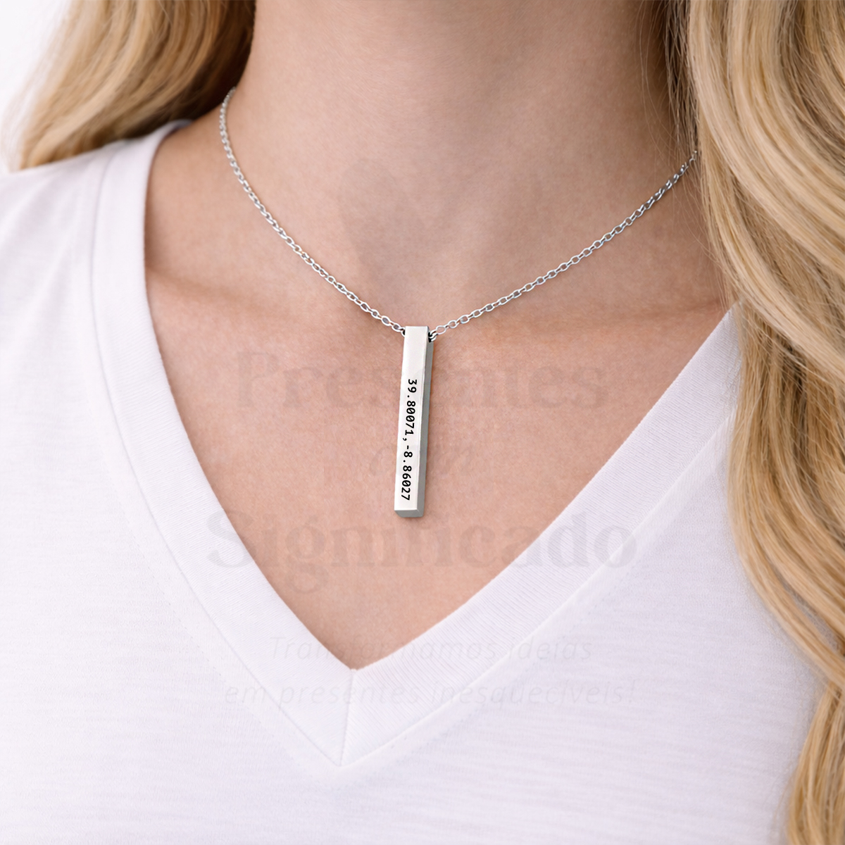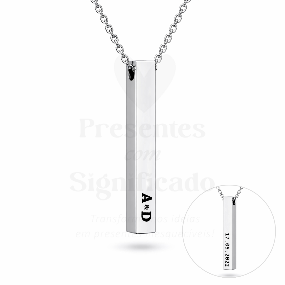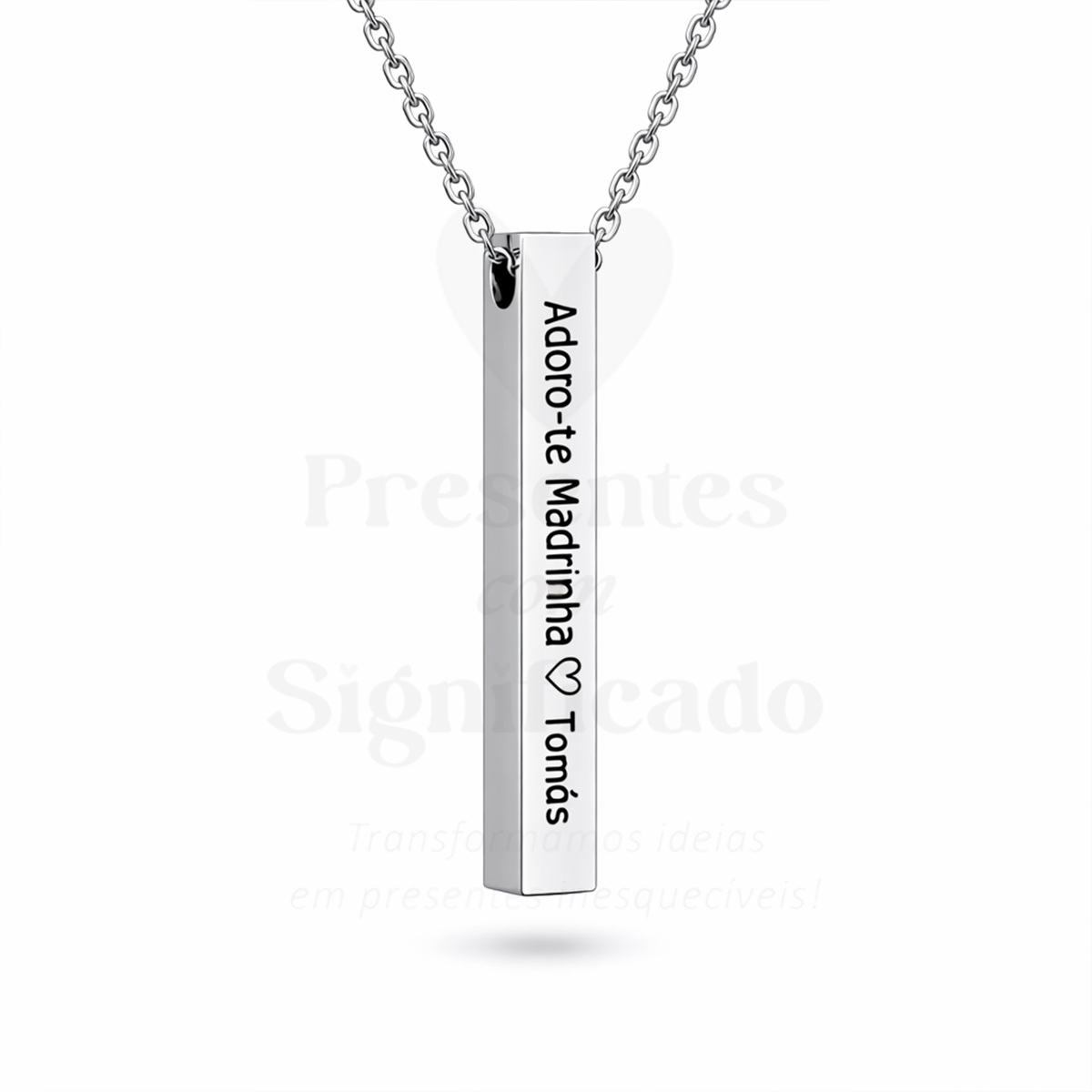 Colar em aço inoxidável c/ pendente barra cubica podendo ser gravado em qualquer uma das 4 faces. Máximo de 3/4 palavras por face.