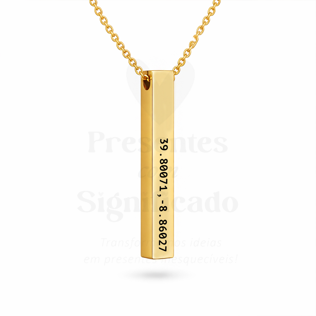 Colar em aço inoxidável c/ pendente barra cubica podendo ser gravado em qualquer uma das 4 faces. Máximo de 3/4 palavras por face.