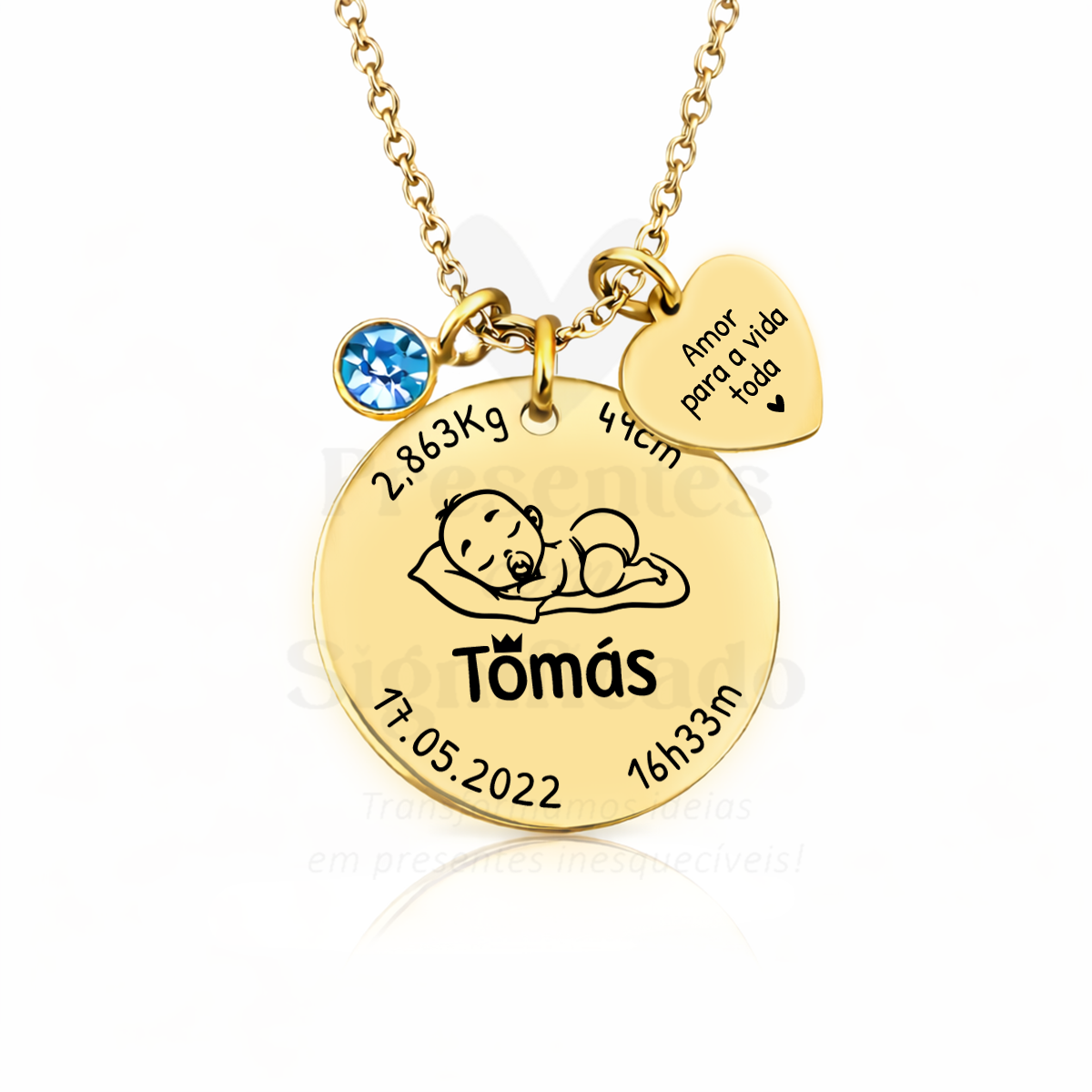 Colar curto em aço inoxidável c/ gravação de dados de nascimento. Possível adicionar gravação no verso com outros dados de nascimento ou outro texto.
