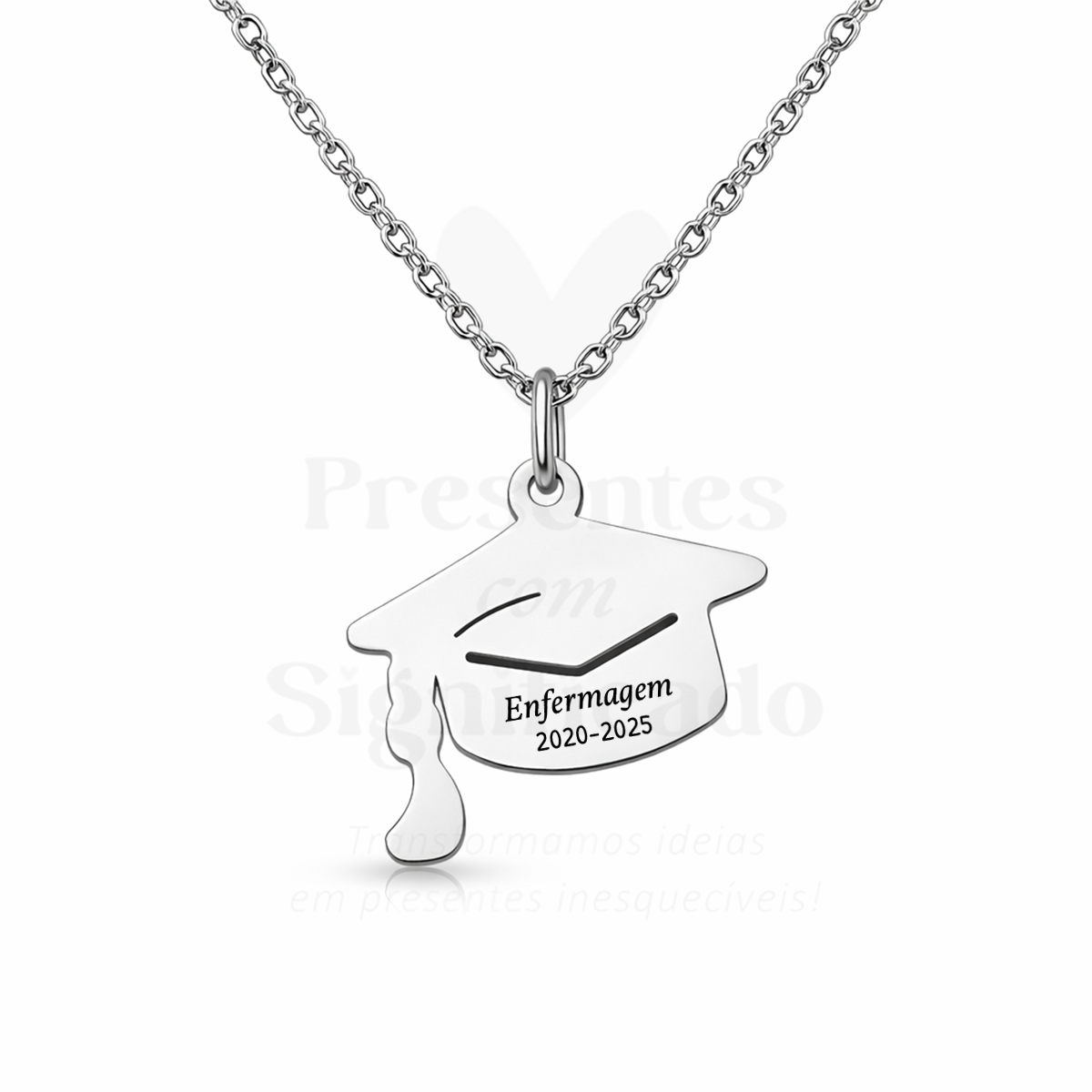 Colar curto em aço inoxidável c/ pendente formato chapéu de finalista c/ gravação de nome e/ou data. Disponível em dourado e prateado.