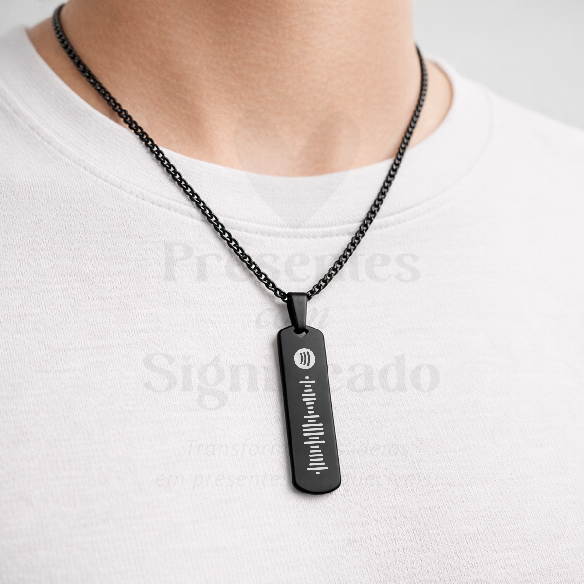 Colar masculino em aço inoxidável preto com chapa estreita e corrente de malha grossa masculina a combinar com gravação de código de música na frente e texto no verso.