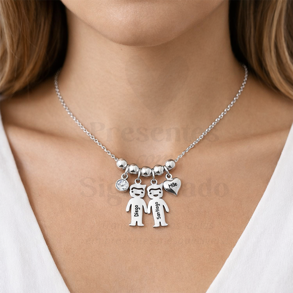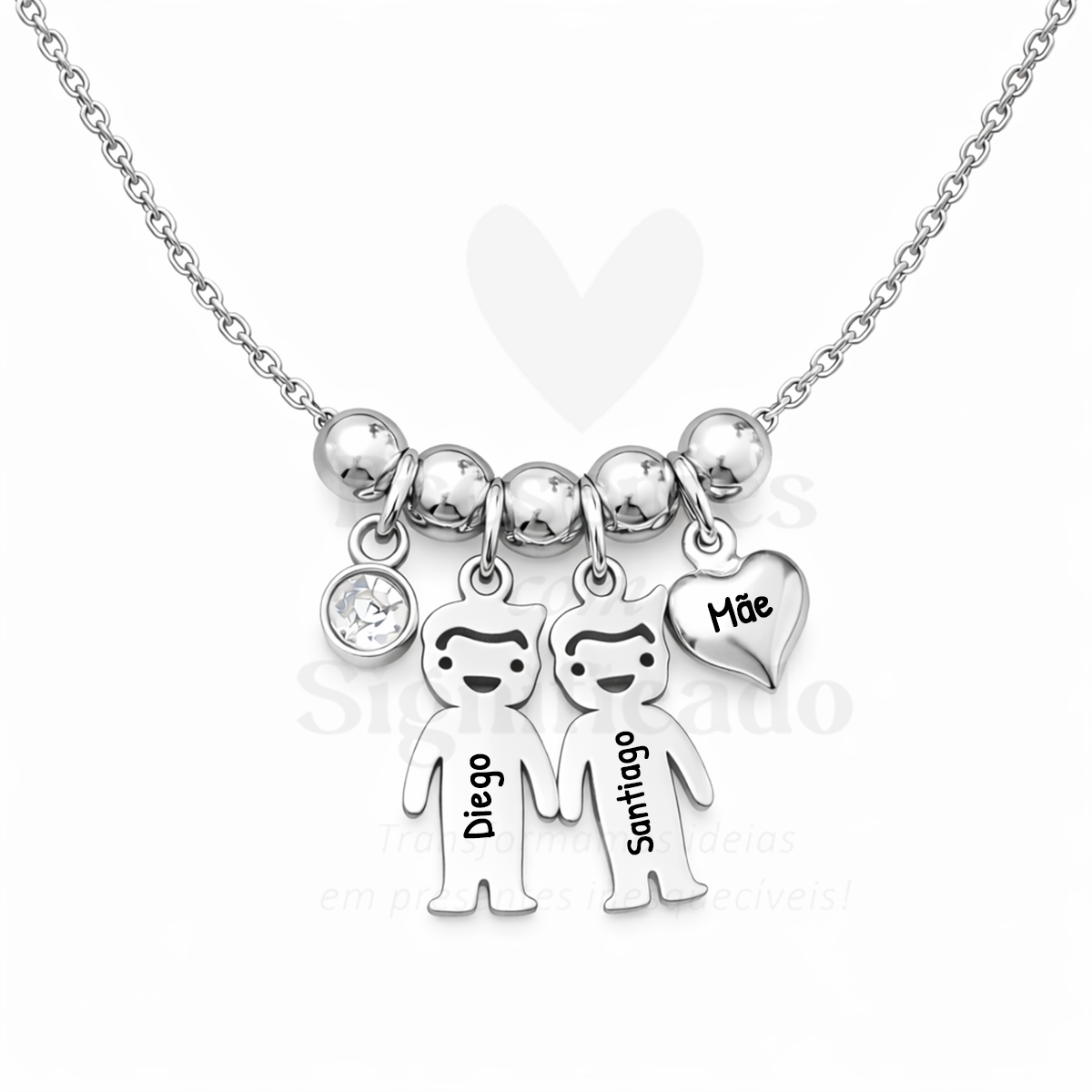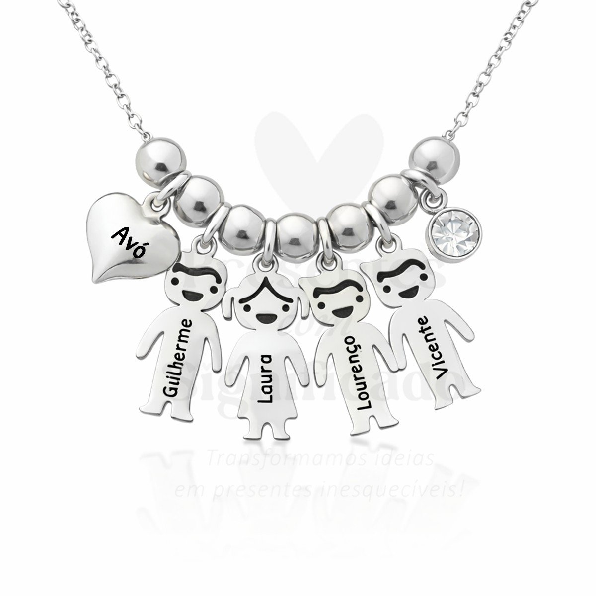 Colar curto em aço inoxidável prateado c/ pendentes no formato de bonecos (menino ou menina conforme os nomes que indicar) e gravação dos respectivos nomes. Pode adicionar mais bonecos e alterar o nome/palavra no coração pendente.
