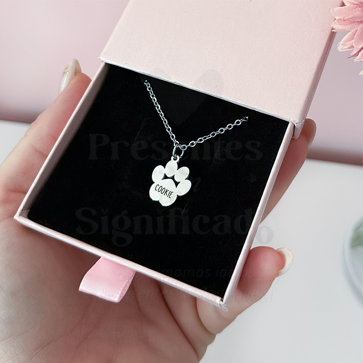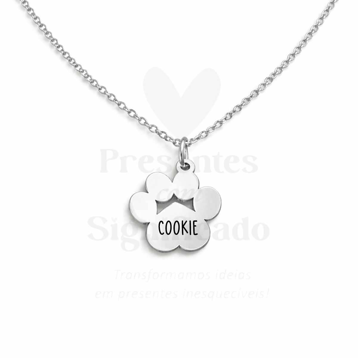Colar curto em aço inoxidável prateado c/ pendente formato patinha de cão c/ gravação de nome.