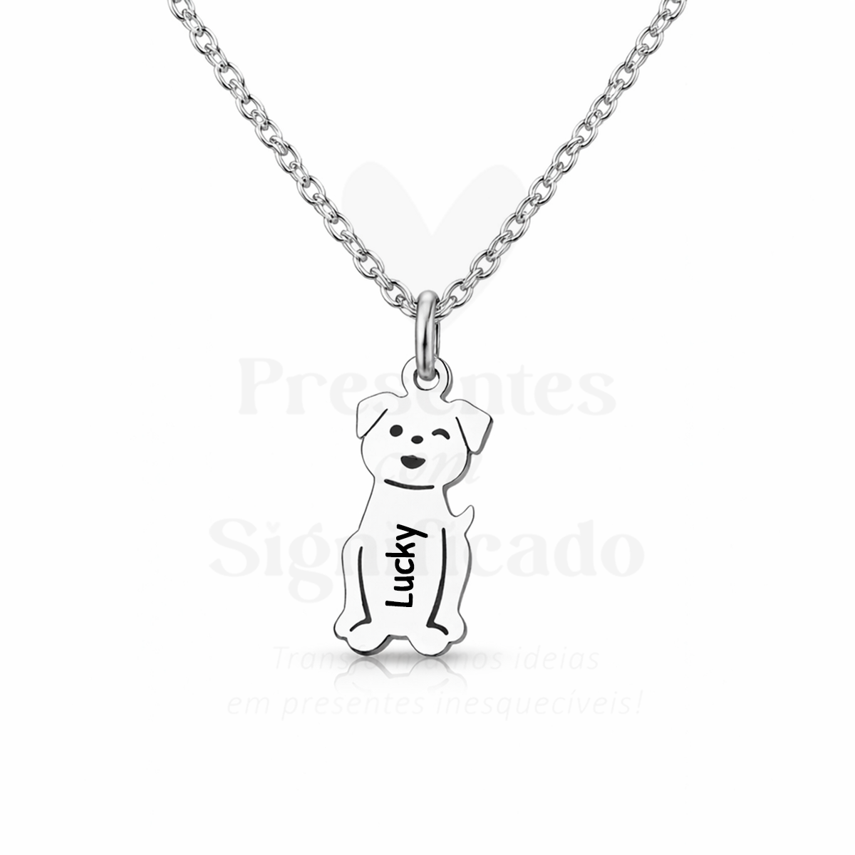 Colar curto em aço inoxidável c/ pendente formato de cão c/ gravação de nome e/ou data. Disponível em dourado e prateado.
