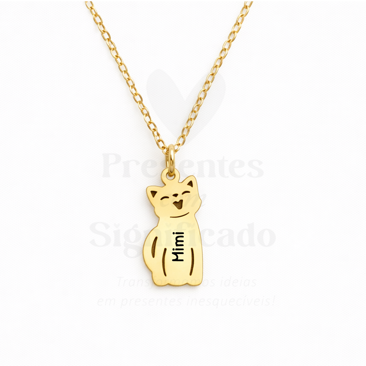 Colar curto em aço inoxidável c/ pendente formato de gato c/ gravação de nome e/ou data. Disponível em dourado e prateado.