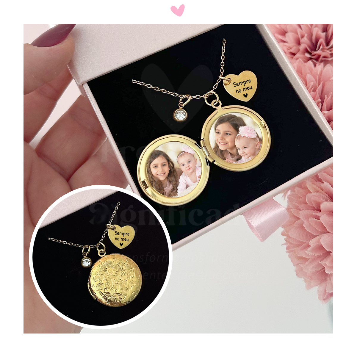 Colar com medalhão padrão floral no exterior, formato redondo em aço inoxidável. Inclui pendente gravado e colocação de foto(s) no interior (máximo 2).