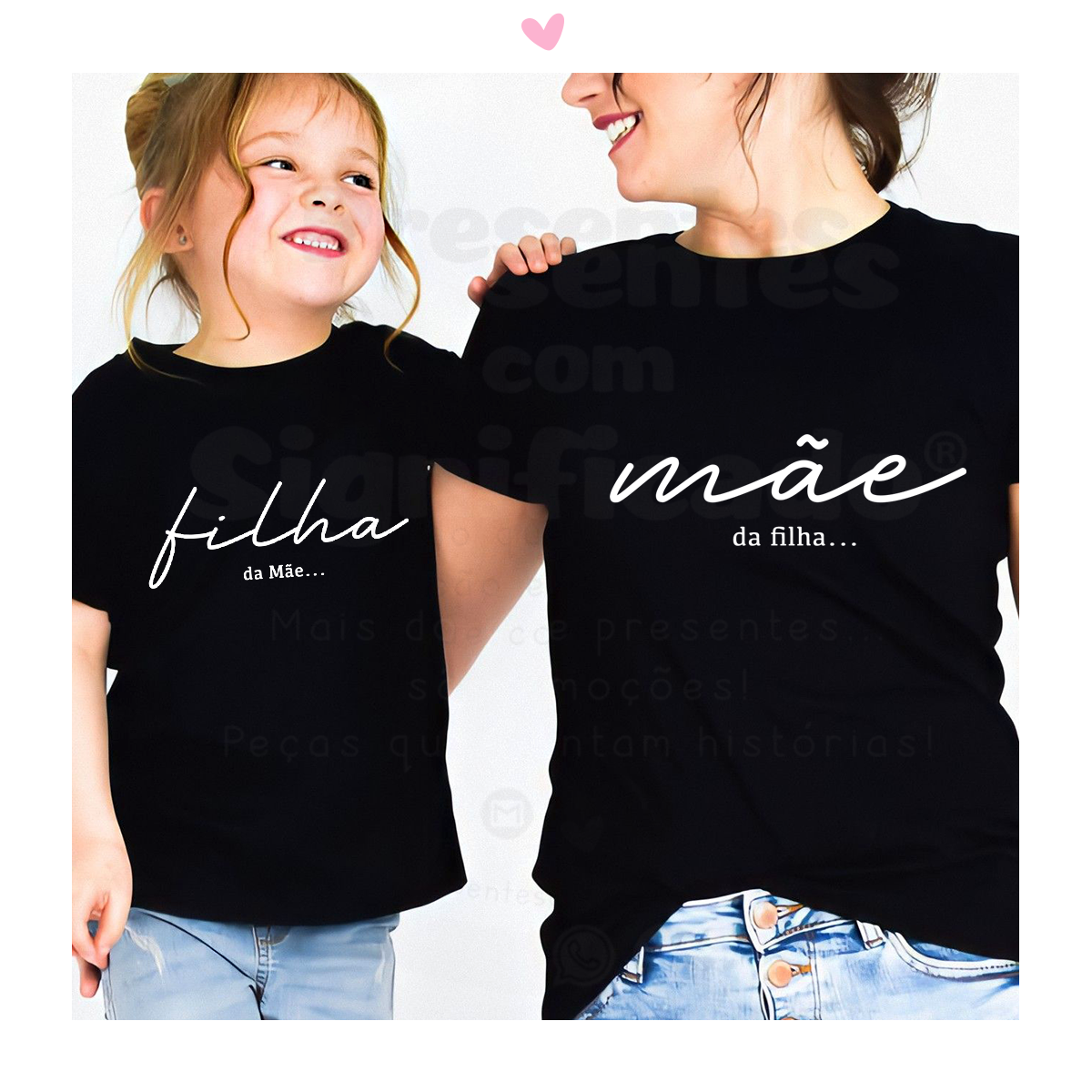 Conjunto adulto + criança em tecido 100% algodão personalizado com texto "Mãe da filha..." (t-shirt adulto) "filha da Mãe!" (t-shirt ou body criança).