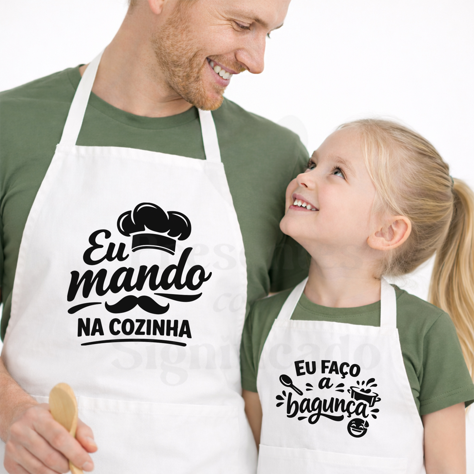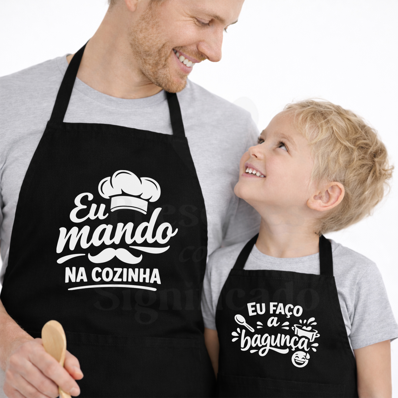 Conjunto de Aventais Pai e Filho(a) personalizados - Eu mando na cozinha/Eu faço a bagunça