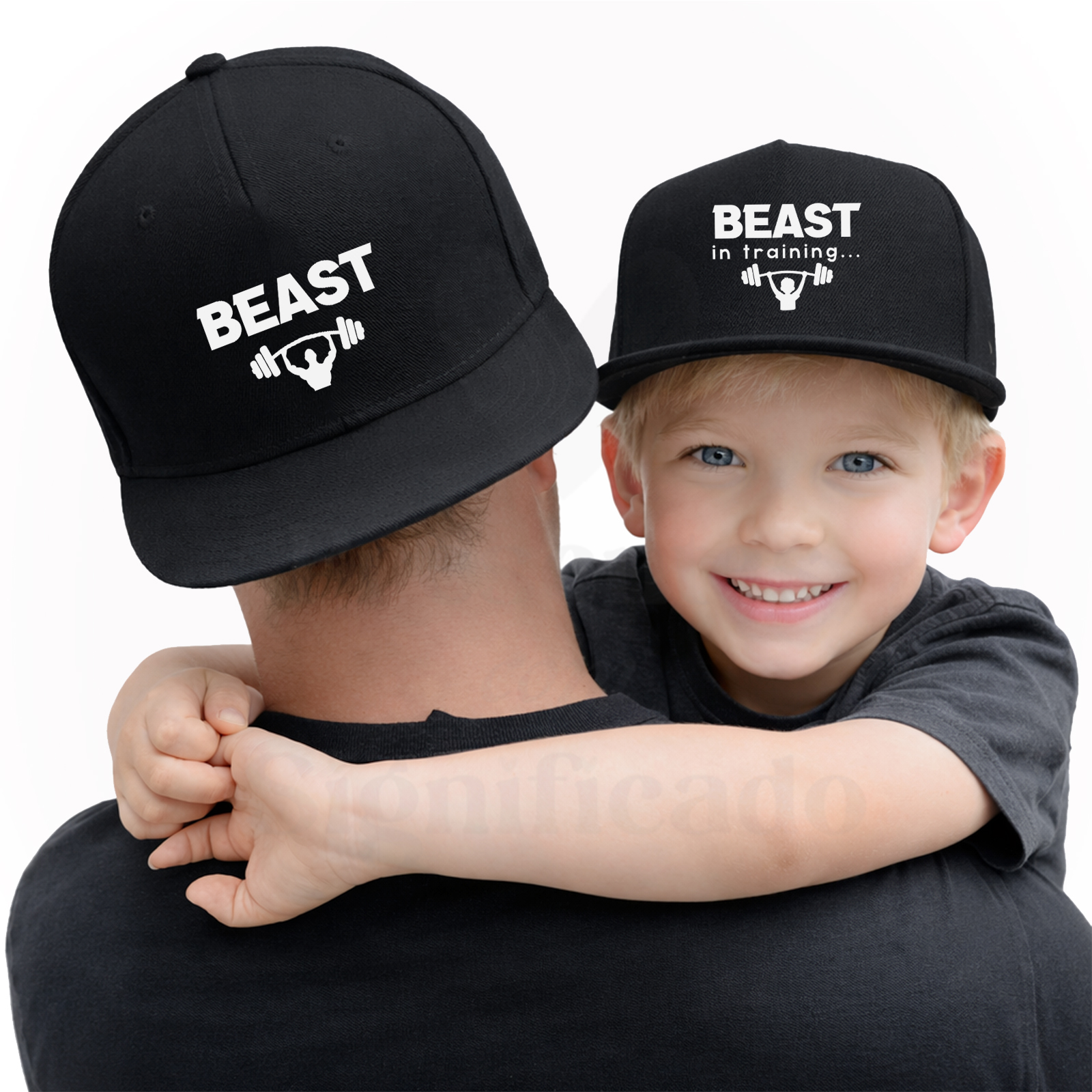 Conjunto de bonés adulto e criança. Bonés pretos estilo "CAP" (com snapback) de pala direita, regulável atrás (com fecho em PVC) e tecido de algodão e acrílico de 300g. Personalizado com texto "Beast! / Beast in training..."