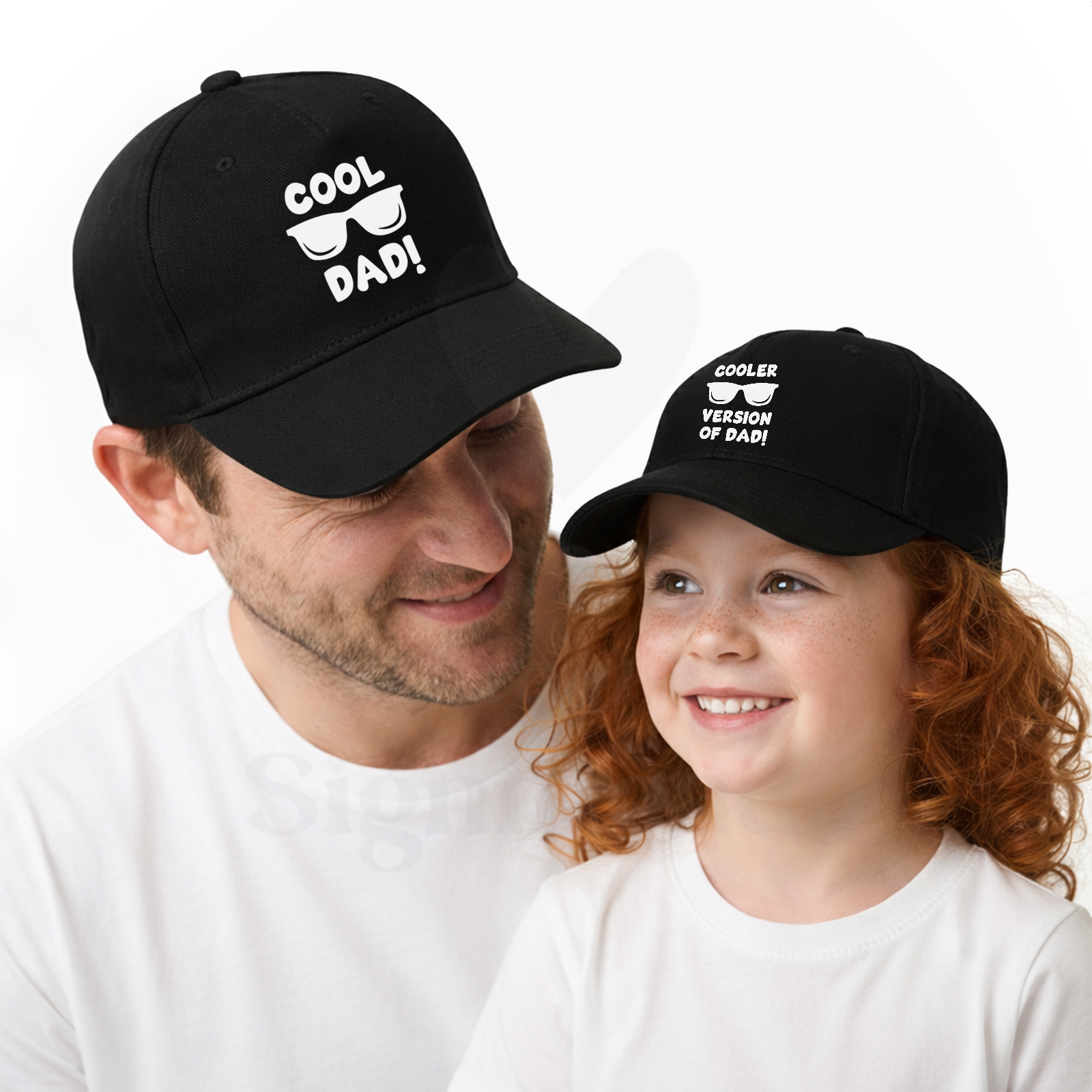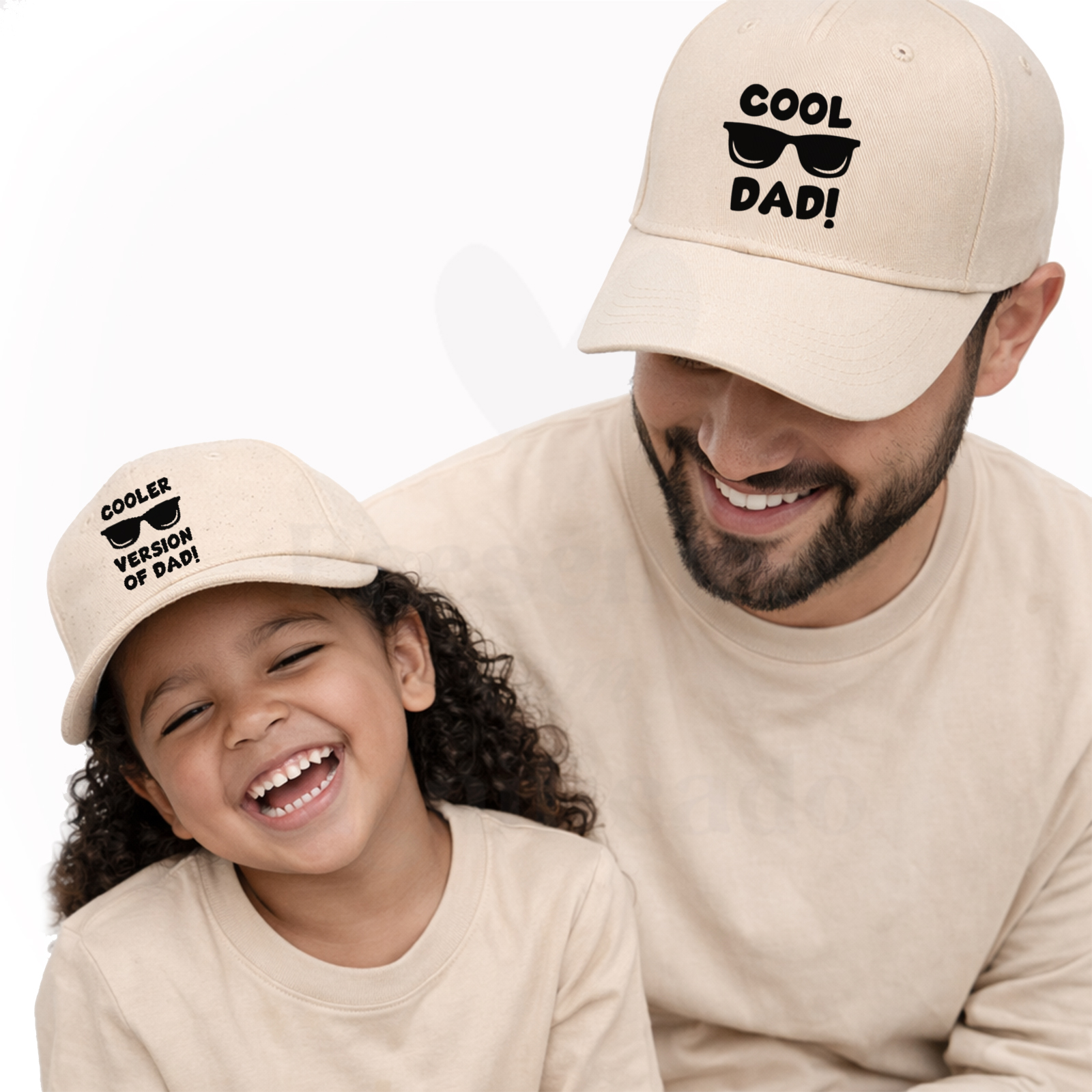 Conjunto de bonés adulto e criança estilo "dad hat" (modelo tradicional) de pala curva, regulável atrás (com velcro no modelo de criança e fivela de metal no modelo de adulto). Personalizado com texto "Cool Dad! / Cooler version of Dad!".