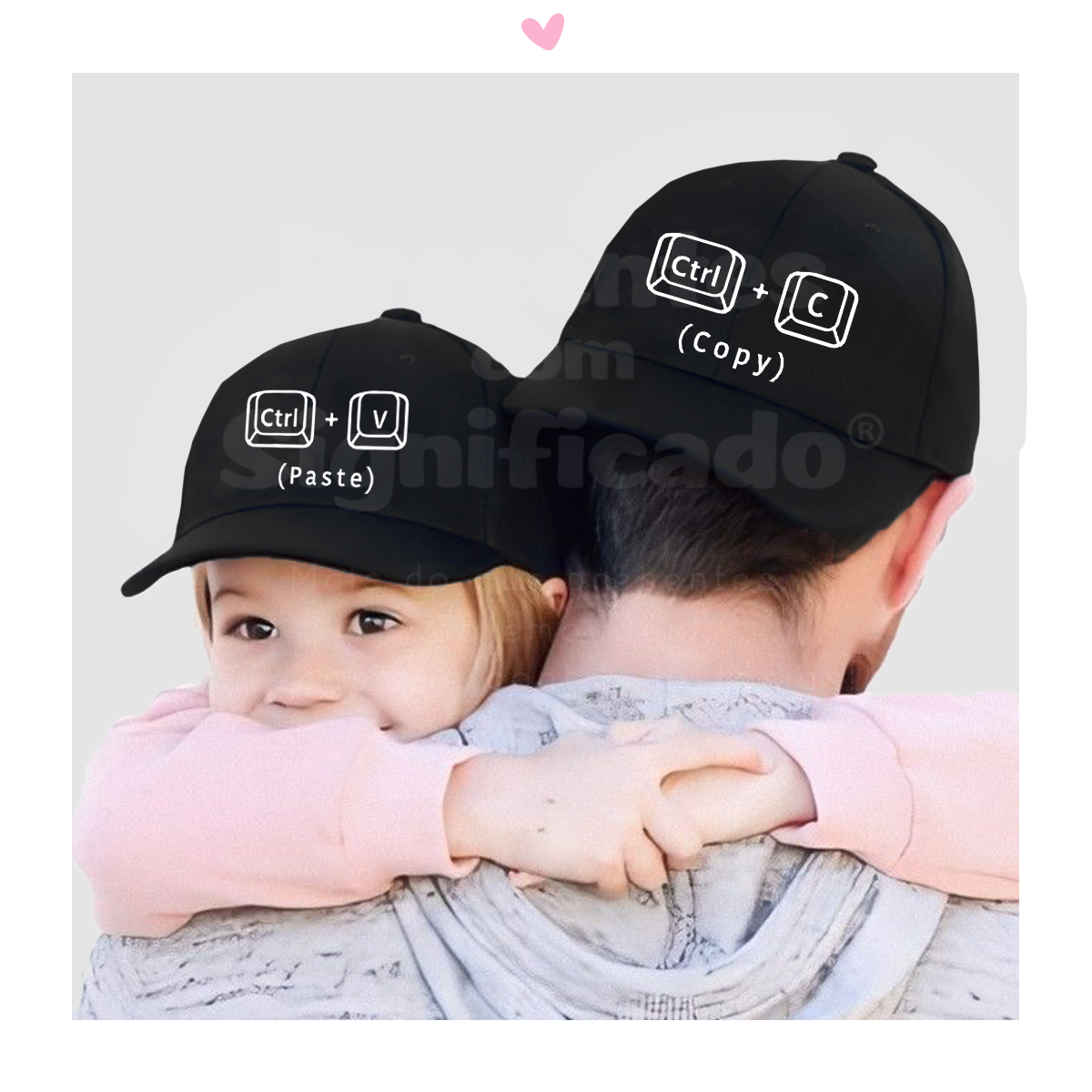 Conjunto de bonés adulto e criança. Boné preto estilo "dad hat" (modelo tradicional) de pala curva, regulável atrás (com velcro no modelo de criança e fivela de metal no modelo de adulto). Personalizado com texto "Copy" e "Paste", podendo também ser personalizado com qualquer outro dos nossos designs ou com design/texto a seu gosto.