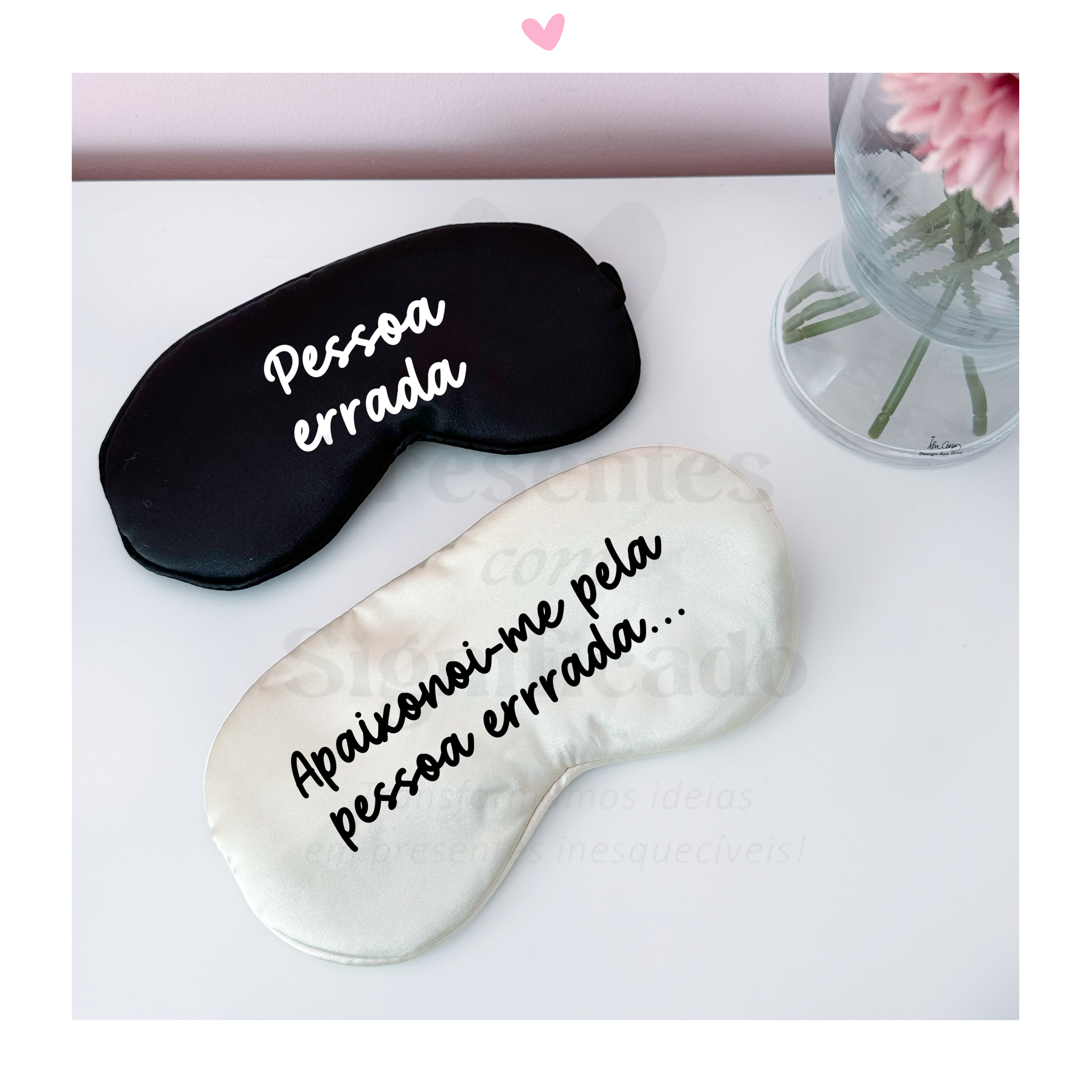Conjunto de duas máscaras/venda de olhos para casal em tecido acetinado personalizadas com palavras/ frase a seu gosto. Disponível em duas combinações de cores.