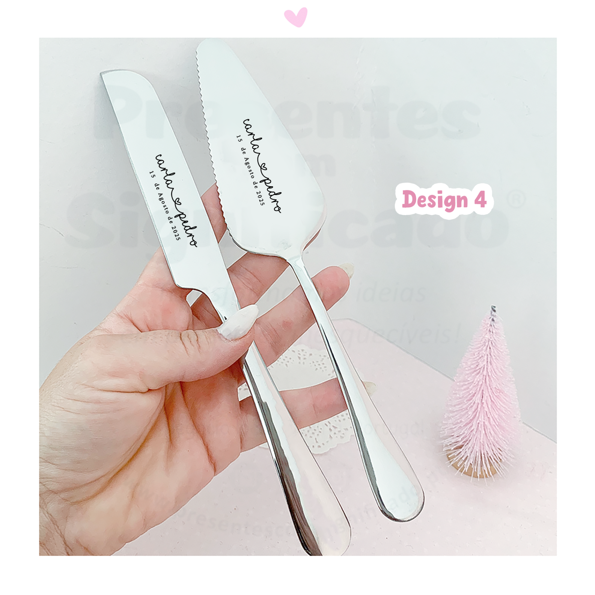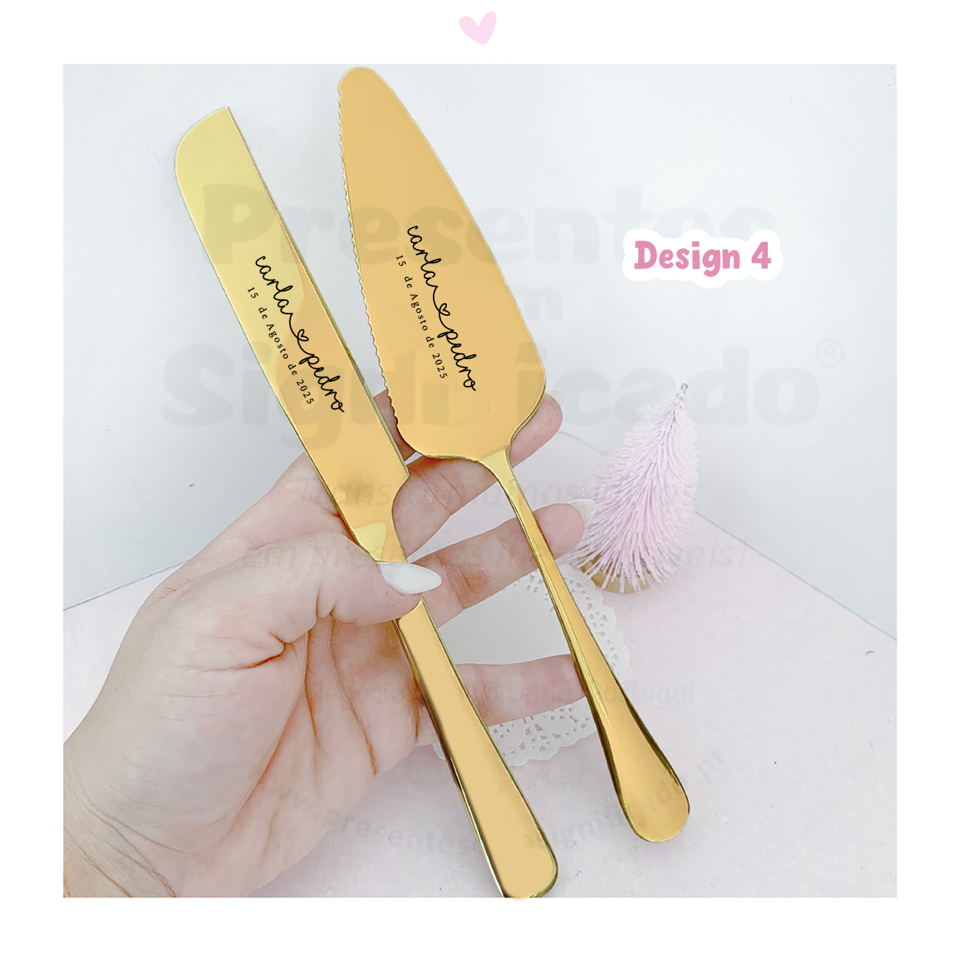 Pá e Faca para bolo com gravação personalizada a laser com nomes e data. É o presente ideal para marcar qualquer evento. Disponível em dourado e prateado.