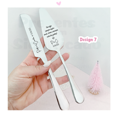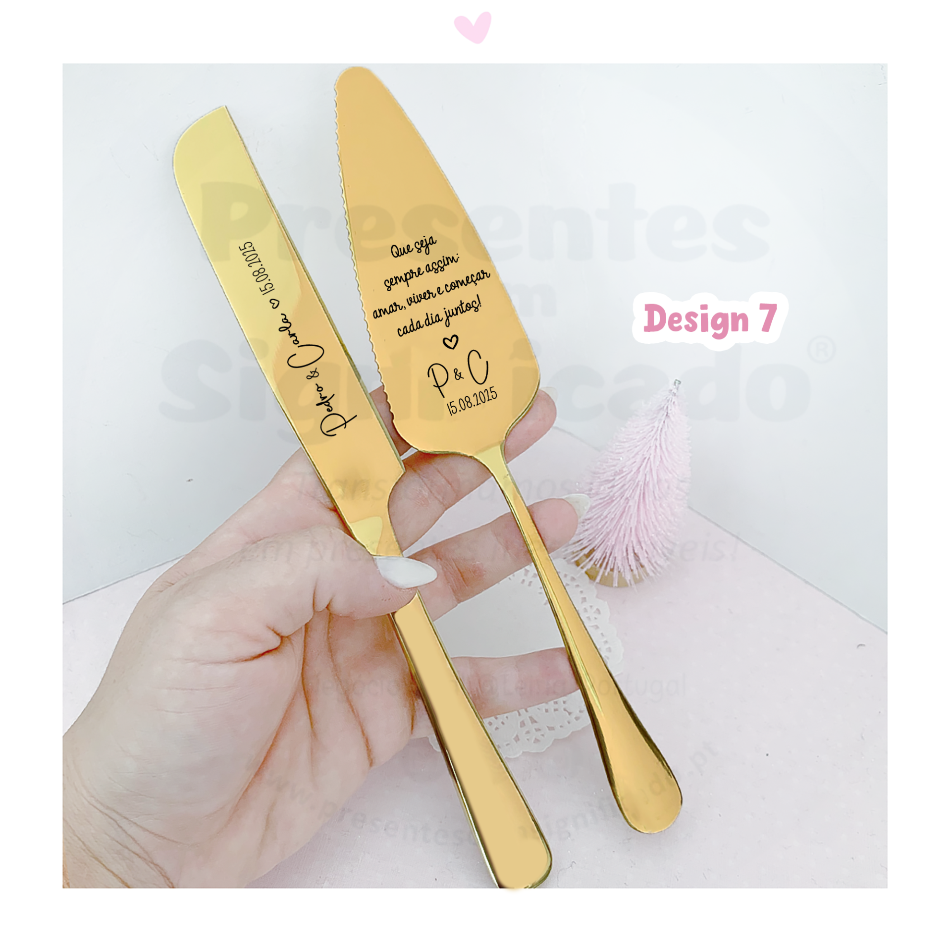 Pá e Faca para bolo com gravação personalizada a laser com nomes e data. É o presente ideal para marcar qualquer evento. Disponível em dourado e prateado.