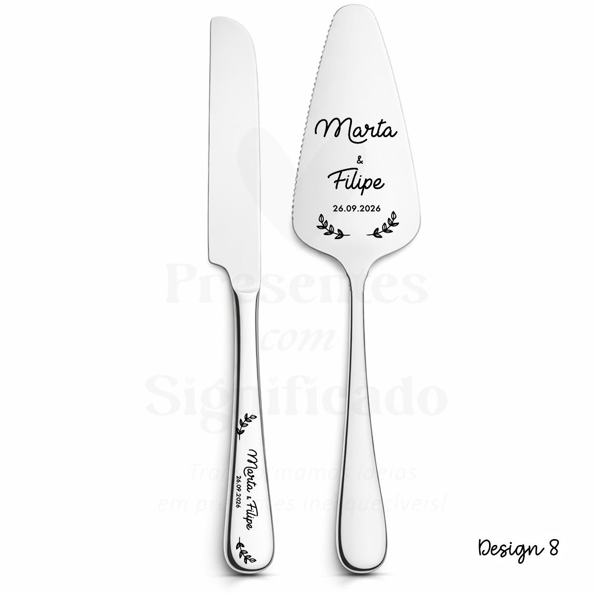 Pá e Faca para bolo com gravação personalizada a laser com nomes e data. É o presente ideal para marcar qualquer evento. Disponível em dourado e prateado.