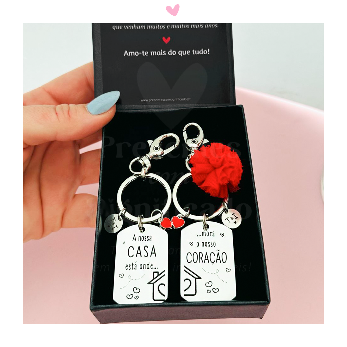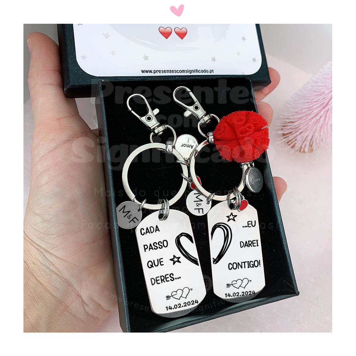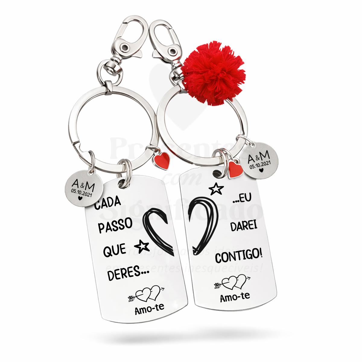 Conjunto de porta-chaves para casal (modelo masculino simples e modelo feminino c/ pompom) c/ chapa de aço inox. retangular gravada a gosto. Inclui caixinha de oferta.