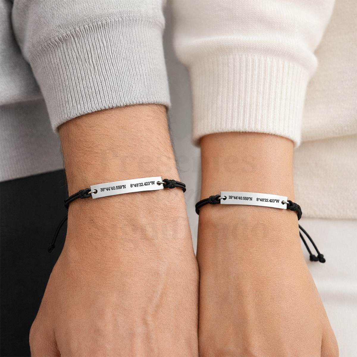 Conjunto de pulseiras ajustáveis em cordão encerado e chapa retangular de aço inoxidável gravada a gosto (possível gravar também no verso). Inclui caixinha de oferta.