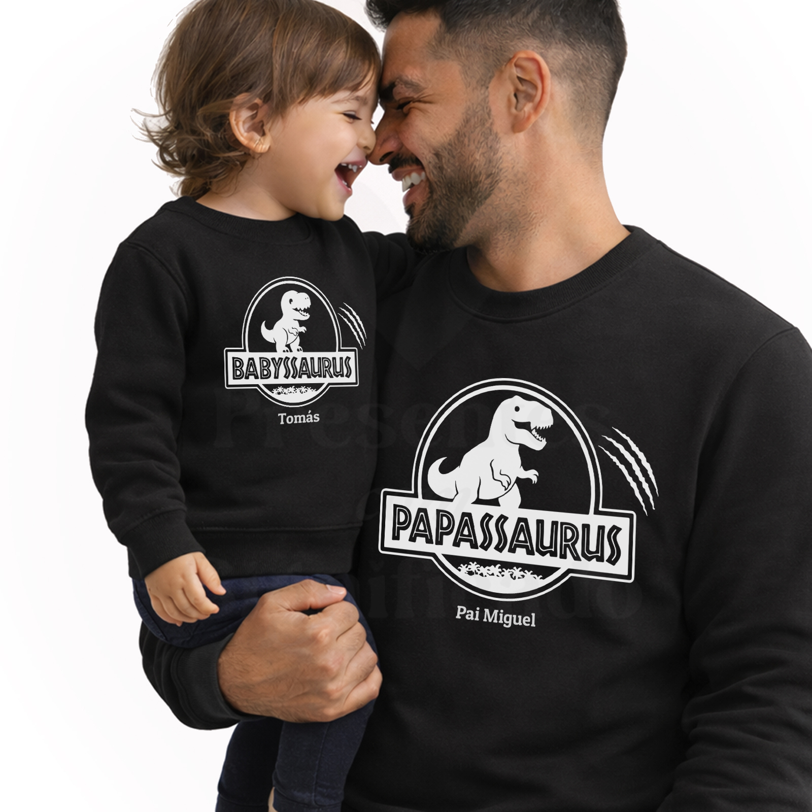 Conjunto de Sweatshirts ou Hoodies em algodão e poliéster de 300g. Tecido cardado por dentro com punhos e cós reforçado. Personalizado com texto "Papassaurus / Babyssaurus" com nomes.