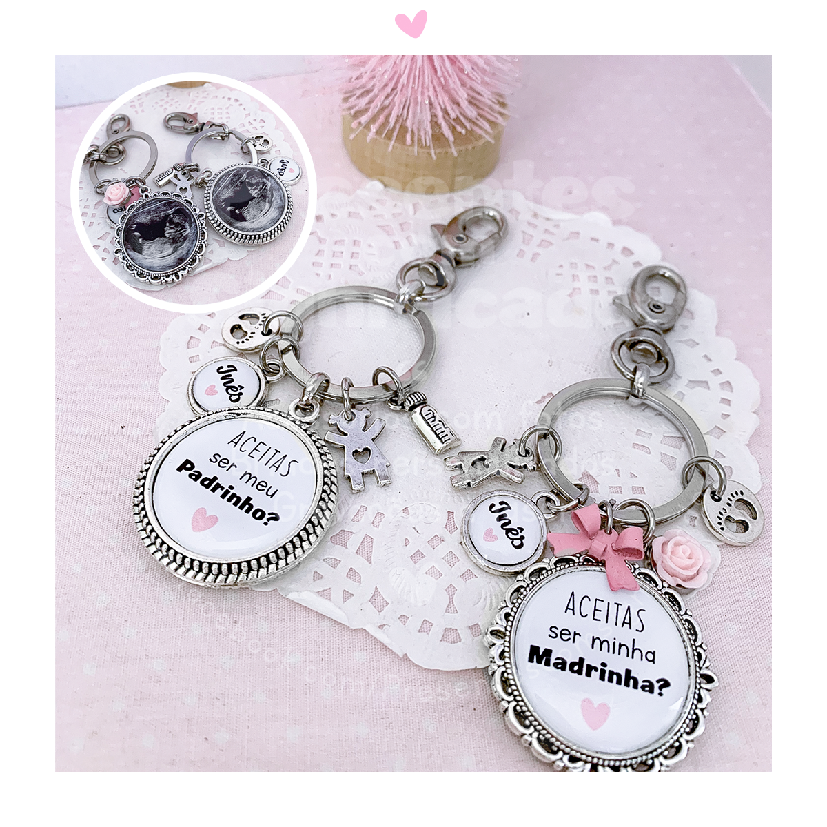 Conjunto de porta-chaves em metal para Padrinho e Madrinha (com argola e mosquetão). O texto da frente é personalizado a seu gosto e no verso da medalha é possível colocar uma foto ou a ecografia. Os pendentes são colocados de acordo com o tema (bebé/criança). Pode adquirir estes produtos separadamente aqui.