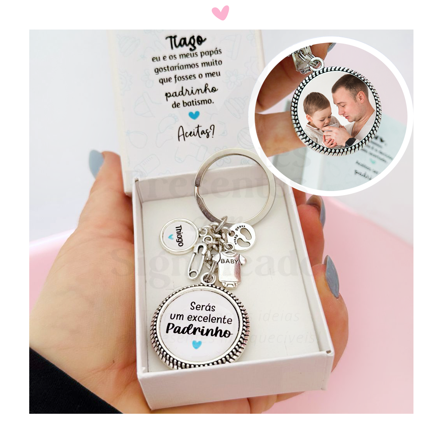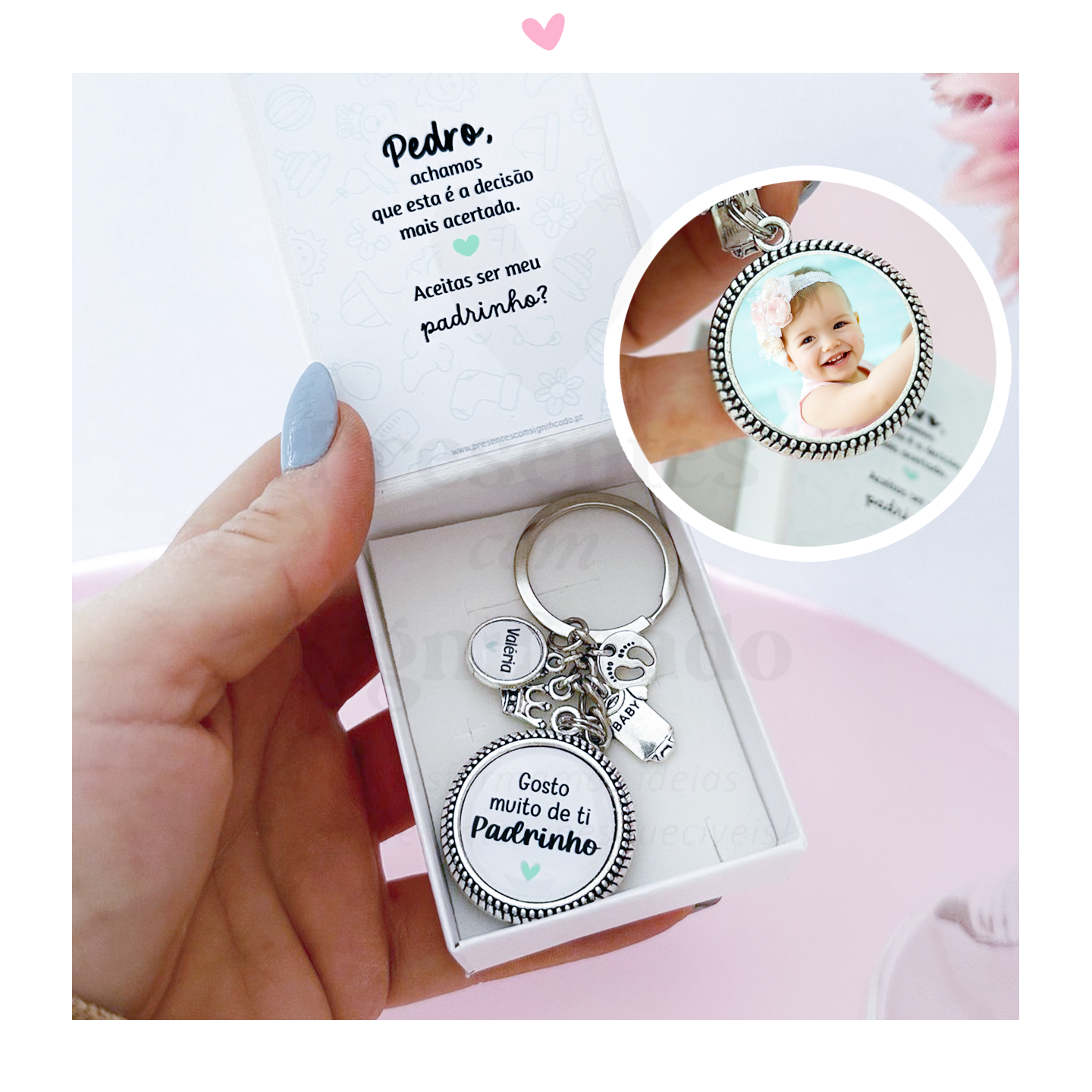 Porta-chaves em metal para Padrinho. O texto é personalizado a seu gosto e no verso da medalha é possível colocar ecografia ou uma fotografia. Os pendentes são colocados de acordo com o tema (bebé/criança).