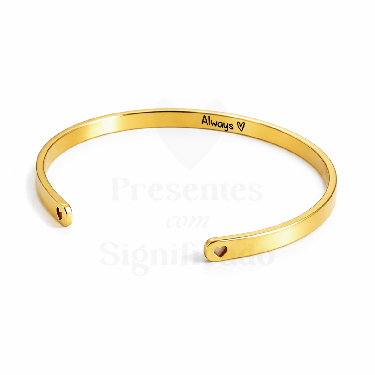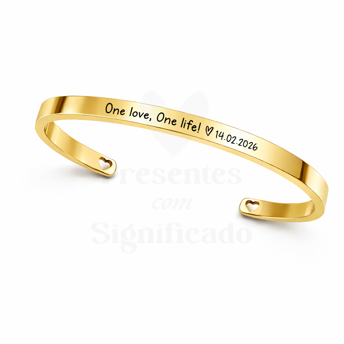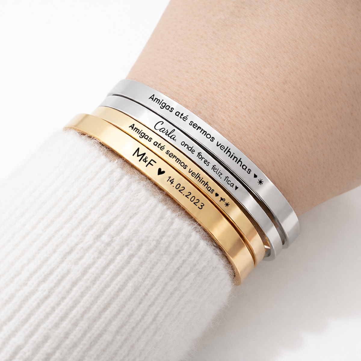 Pulseira formato escrava em aço inoxidável c/ gravação personalizada. Disponível em duas larguras: 4 e 6mm. As pontas da pulseira têm um coração recortado; a frente é em aço brilhante e as costas em aço polido (pode ser gravada dos 2 lados). A pulseira pode ajustar-se ao pulso bastanto apertar ligeiramente as laterais.