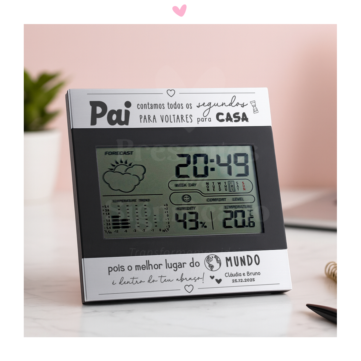 Estação de secretária em alumínio e com ecrã LCD. Dispõe de calendário, relógio, despertador, termómetro, calendário de aniversários e informação meteorológica. Inclui 2 pilhas AAA.