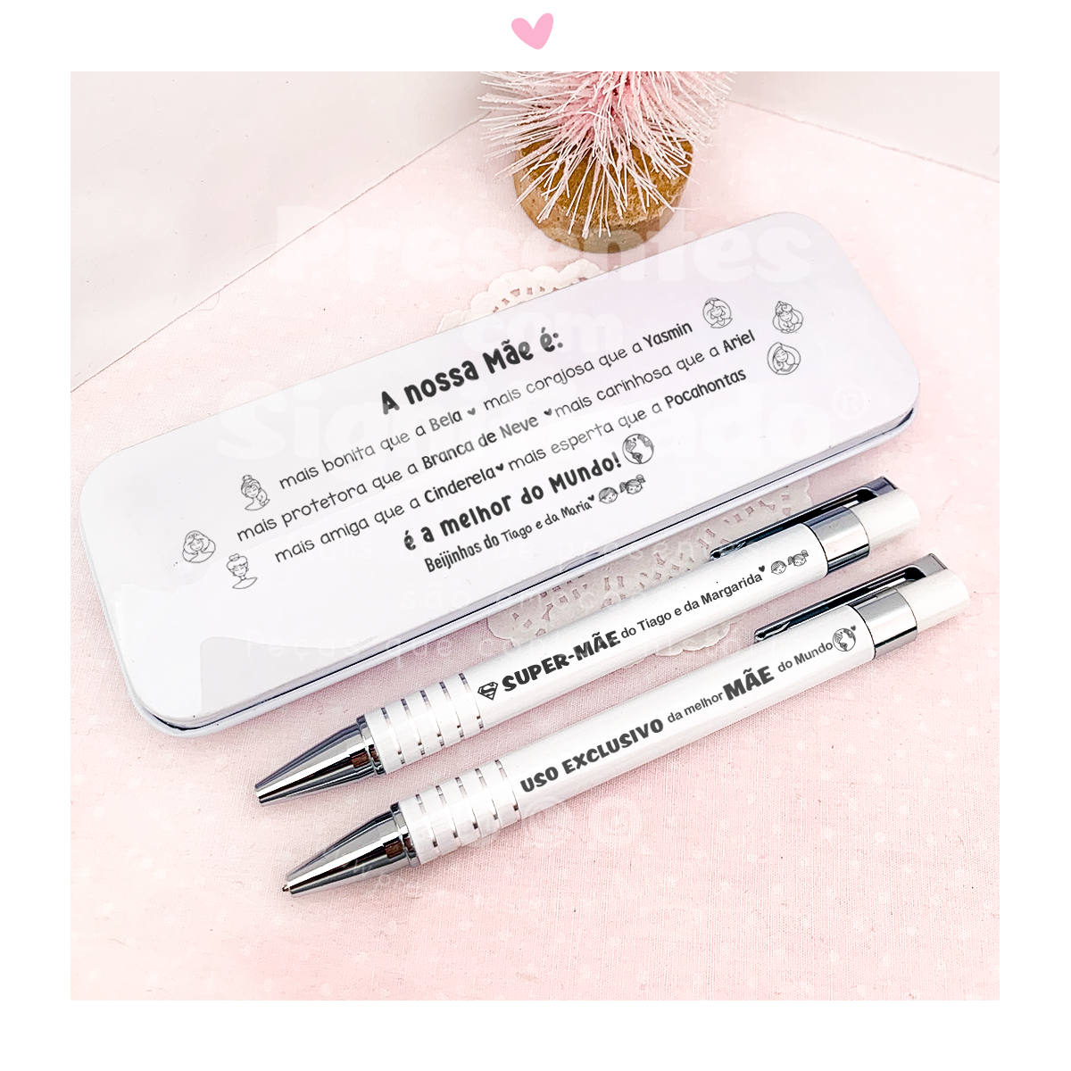 Se pretender igual ao exemplo, basta colocar essa indicação na personalização indicando apenas nomes/datas a alterar. Tamanho do produto: 13x5x1,5cm | Caneta escrita azul - minas 0,05