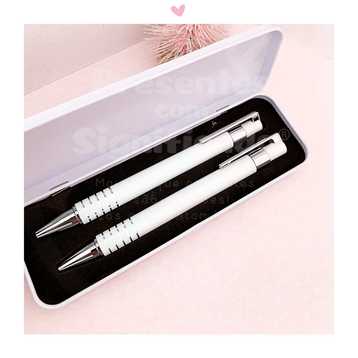 Estojo em latão personalizado c/ textos a seu gosto. Inclui 1 caneta e 1 lapiseira (porta-minas) que pode também personalizar com frases.