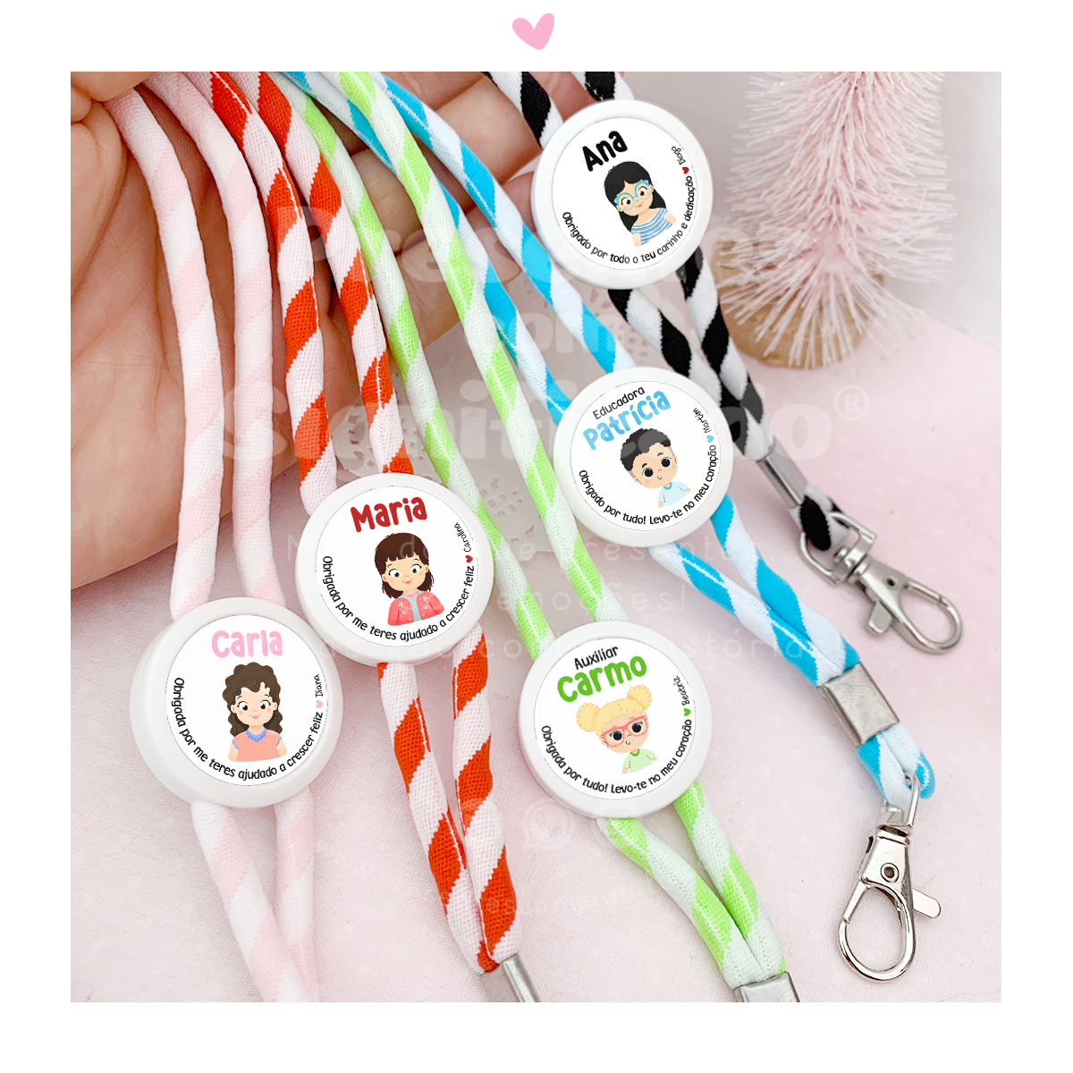 Fita comprida para pescoço c/ mosquetão para chaves. Fabricada em terylene tubular com várias cores à escolha, personalizada c/ frase curta e boneco ou só nome e cargo profissional.