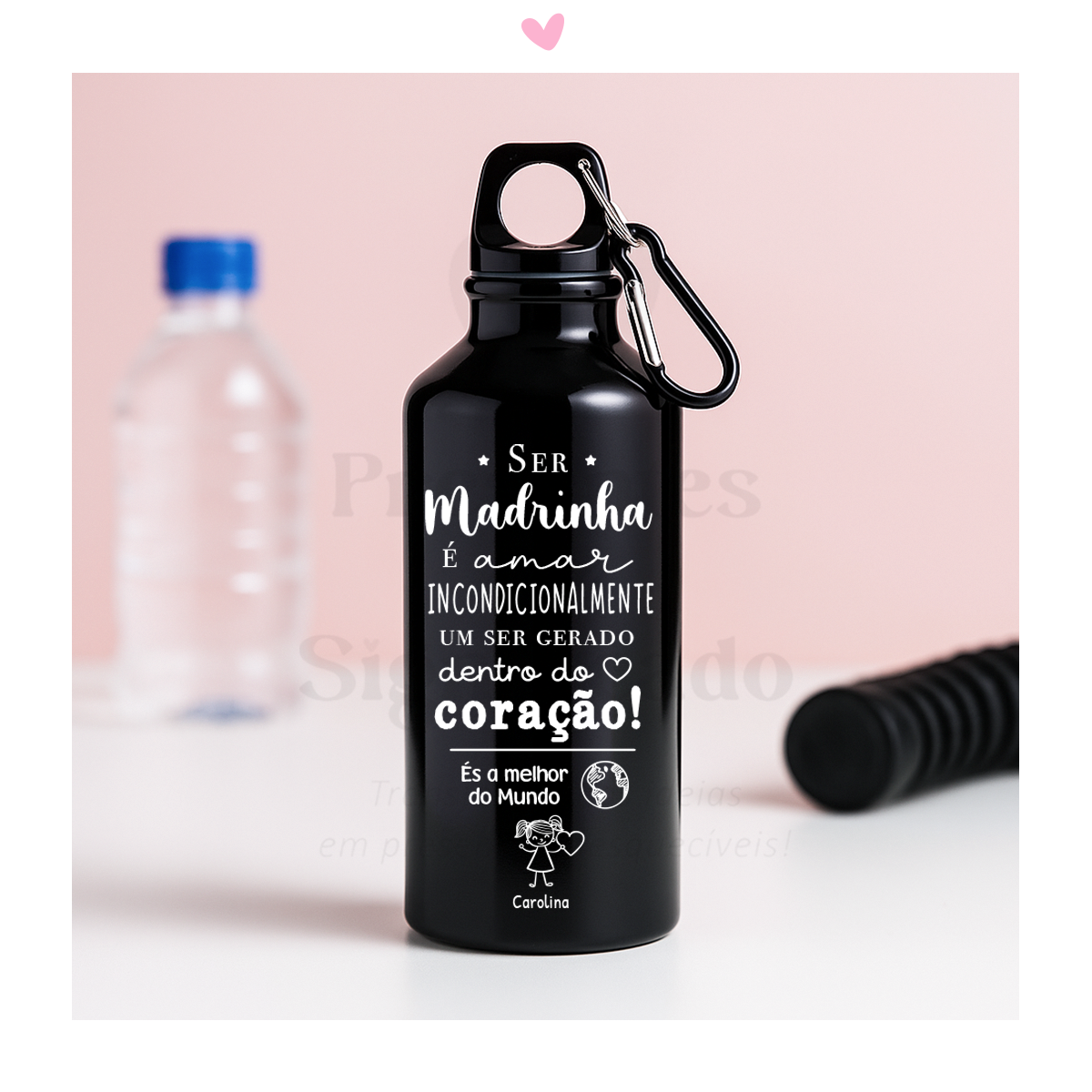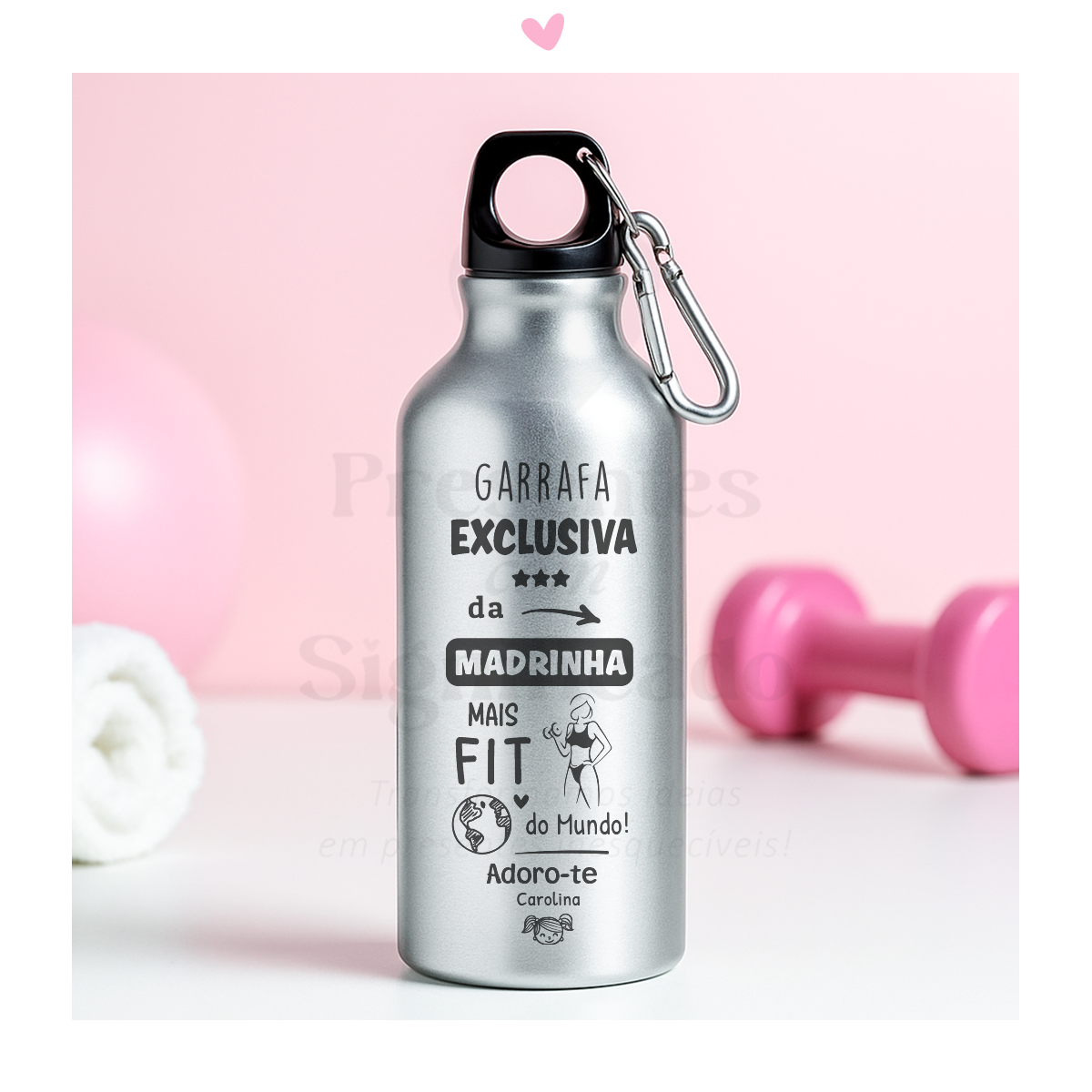 Garrafa em alumínio c/ mosquetão gravada com texto a gosto. Disponível em 3 cores.