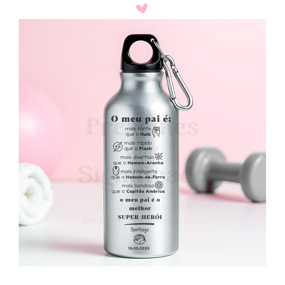 Garrafa em alumínio c/ mosquetão gravada com texto a gosto. Disponível em 3 cores.