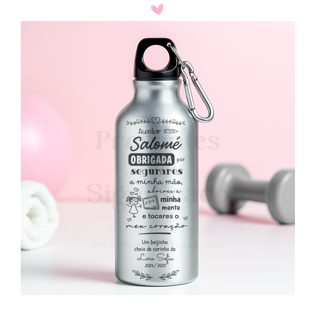 Garrafa em alumínio c/ mosquetão gravada com texto a gosto. Disponível em 3 cores.