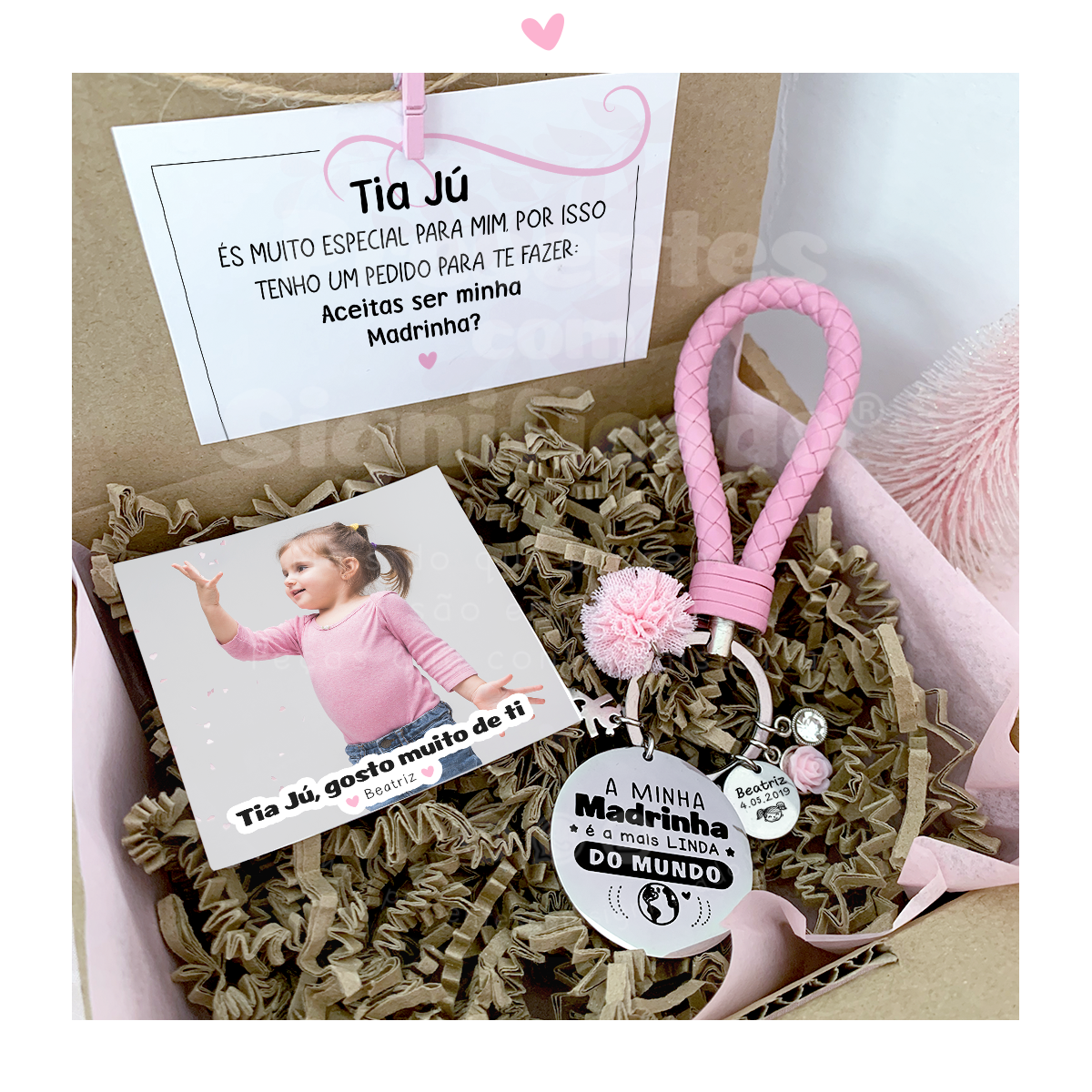 Caixa presente com decoração rosa. Inclui: 1 cartão c/ dedicatória personalizável, 1 íman 7x7cm c/ foto e texto e 1 porta-chaves c/ gravação personalizada. Pode personalizar todos os textos dos produtos.