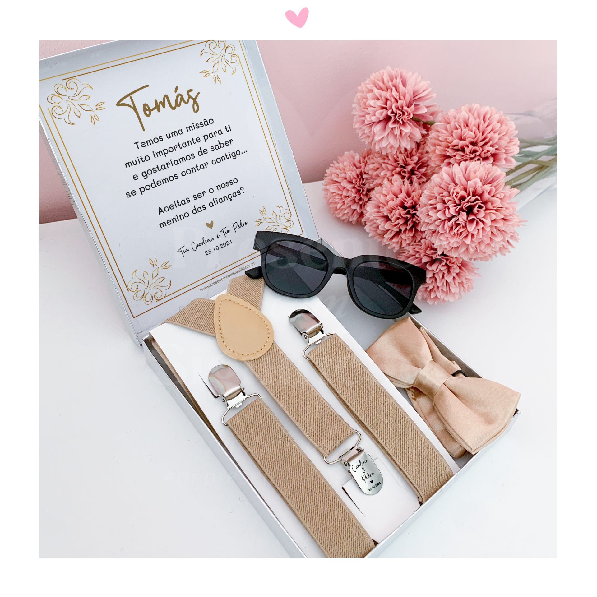 Gift box para convite de menino das alianças (pajem). A gift box inclui a caixa com dedicatória personalizada a seu gosto e um kit para o dia do evento com óculos de criança, suspensórios e laço de pescoço no tom bege. Os suspensórios incluem gravação opcional na presilha traseira, podendo optar por colocar nomes e/ou datas.