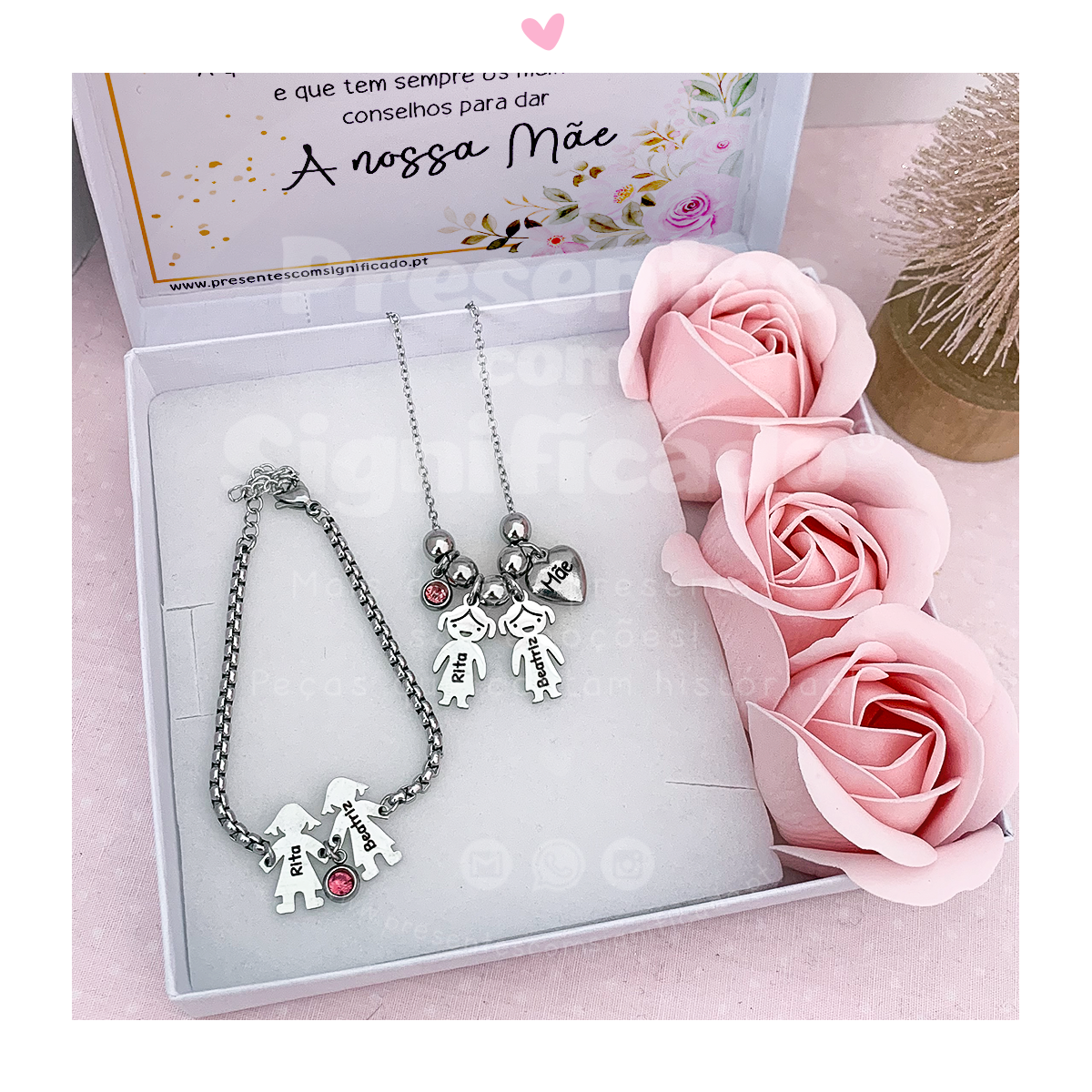 Caixa presente (fecha com laço).Inclui: 1 colar aço inox. c/ meninos, 1 pulseira em aço inox. c/ meninos e 3 rosas de cheiro. Disponível em dourado ou prateado. A caixa inclui um texto/dedicatória na tampa que pode personalizar ao seu gosto. Indique-a no campo próprio + abaixo.