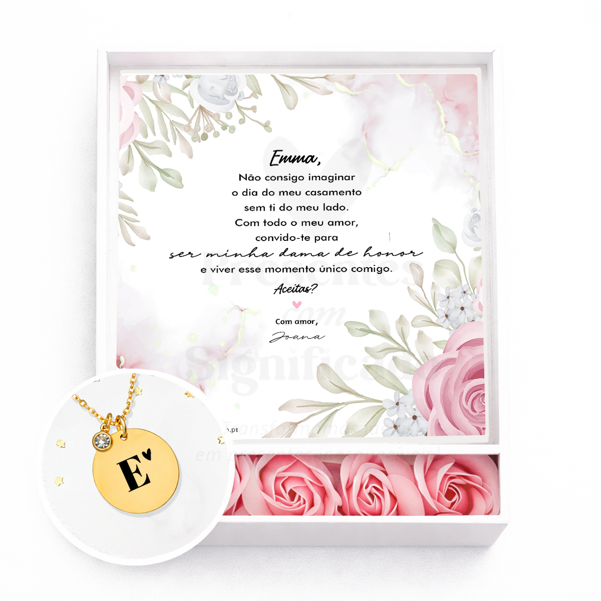 Caixa presente (fecha com laço) com colar curto em aço inoxidável (disponível em prateado ou dourado) com gravação personalizada + 4 rosas de cheiro. A caixa inclui um texto/dedicatória na tampa que pode personalizar ao seu gosto. Caso queira esse texto igual ao exemplo, basta dar essa indicação.
