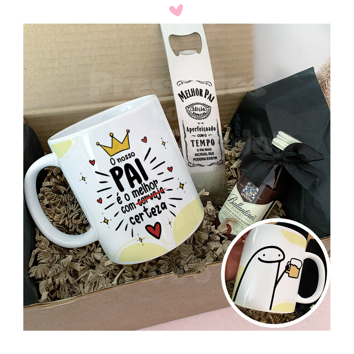Caixa presente (fecha com laço). Inclui: 1 caneca personalizada, 1 abre-caricas grande em aço personalizado e 1 mini-garrafa de bebida. Pode escolher qualquer modelo de caneca (veja aqui).